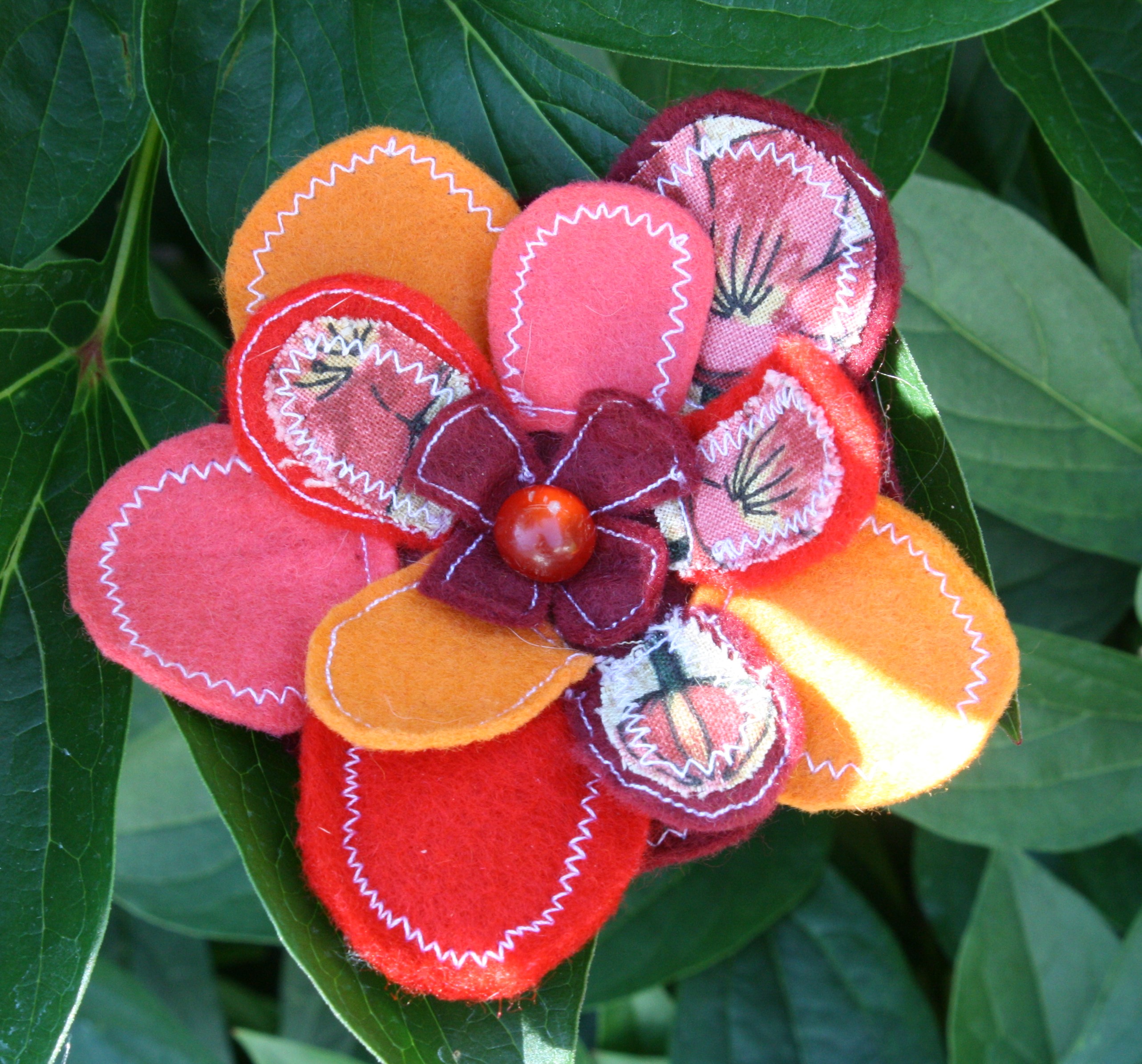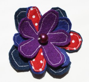 Werkbeschrijving: Knip 3 (of 4) bloemetjes – van verschillende kleuren vilt – in verschillende maten. Beslis welk bloemblaadje een ander stofje kan gebruiken – knip op maat en leg erop. Nu even onder de naaimachine een randje stikken (Tja hier heb je even wat geduld en concentratie bij nodig.) Leg de bloemetjes op elkaar en zet met een steekje vast. Oh ja en dan nog even een kraaltje. Bij de rechter heb ik afzonderlijke blaadjes gemaakt. Is wat meer werk.