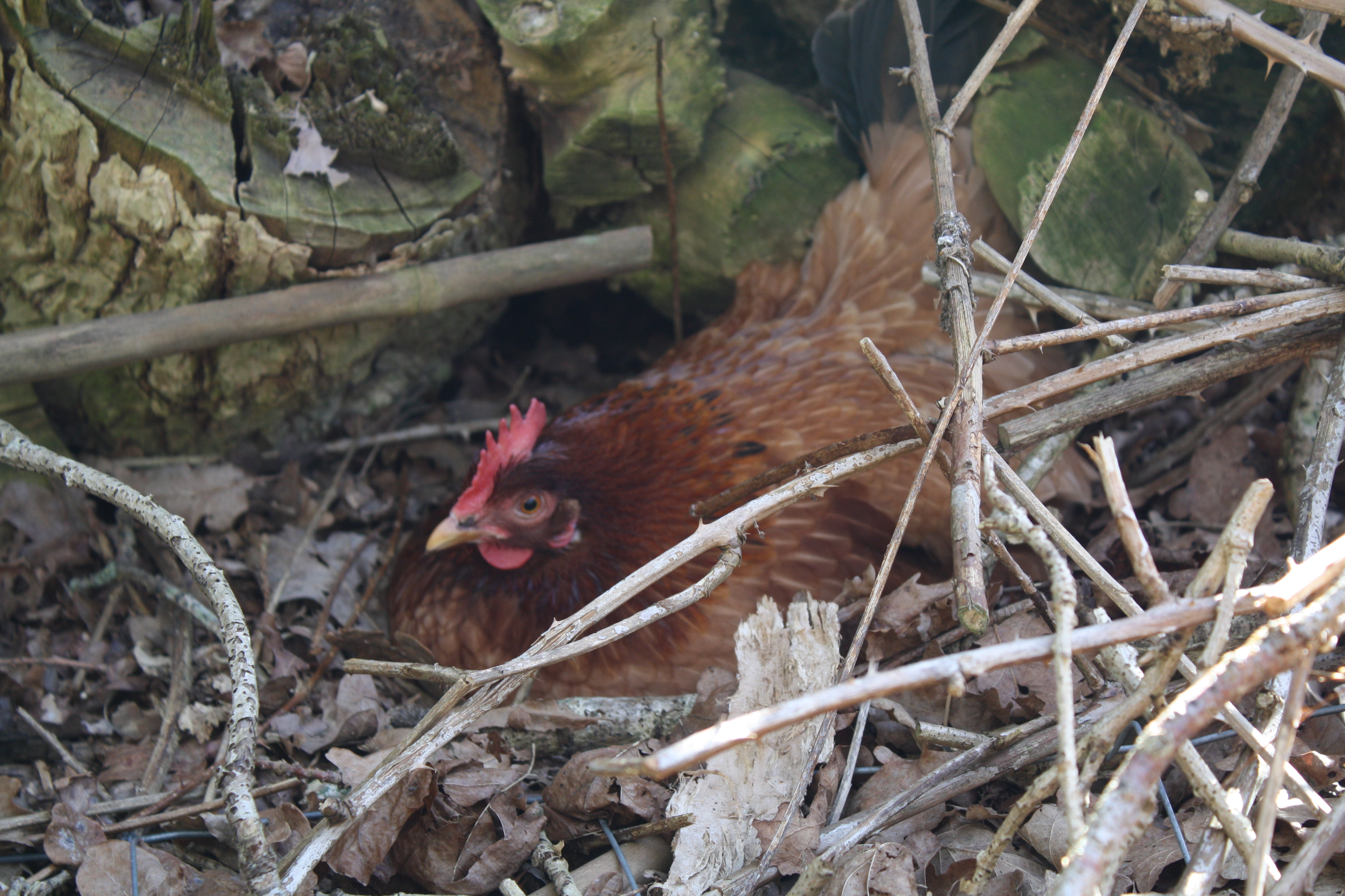 Elk jaar is er 1 slimme kip die de ren weet te ontvluchten. Deze keer heeft hij zijn nest achter wat brandhout gesetteld. Tegen etenstijd rent hij in een sneltreinvaart naar de ren om een vorkje mee te prikken. Verder zit ze de hele dag op haar nest.