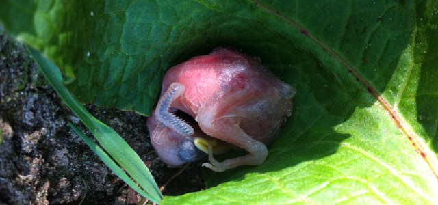 Een paar uur later kon ik het toch niet laten om even te gaan kijken, en wat dacht je? Hij lag er nog. Tja wat moet je dan met zo’n hulpeloos poedelnaakt ding? “Gewoon laten liggen, zo is de natuur!” zei mijn verstandige ik. Toch maar in een bakje en even langs het de dierenopvang, besloot ik. Shit gesloten…
