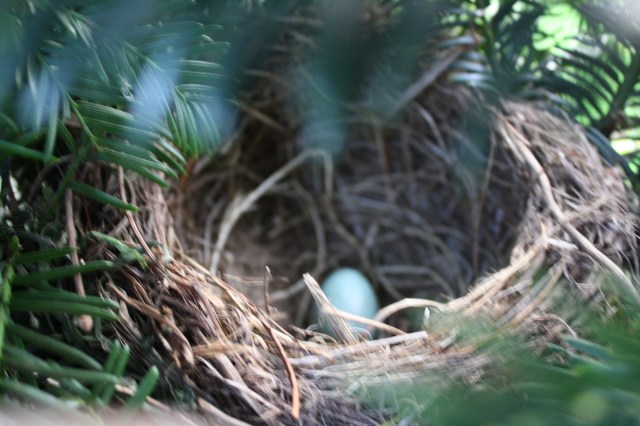 Maar goed, er is dus nog hoop want ER ZIT EEN MERELNEST IN ONZE HEG! Dat is leuk. Als je er langs loopt zie je moeke-merel lekker op haar nest zitten. Toen ze even was shoppen zag ik dat ze 3 blauwe eitjes in haar magnifieke nest had liggen. Spannend! Las dat de merel de jongen, nog voordat ze kunnen vliegen, al uit het nest gooien. Red oe d’r met, zeggen ze in Twente. Dat wordt nog wat met Sonja…