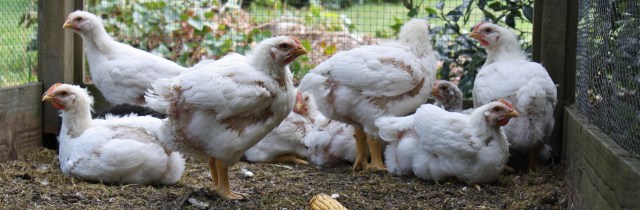 Het was even schrikken om de slacht “kuikentjes” weer te zien. (die witte hierboven) Ze zijn echt enorm gegroeid. Zo speels als die andere kuikentjes zijn, zo sloom zijn deze. Ze zijn dik, lui, lelijk en hebben bijna geen veren. Waarschijnlijk helemaal zo gefokt om zo veel en zo snel mogelijk vlees te produceren. Van zulk soort kippen komt je kipfileetje die je in de supermarkt koopt.