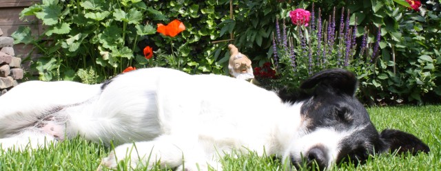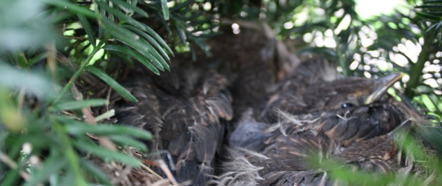 We snappen nu waarom de merel maar 4 eieren had gelegd… Meer pasten er uiteindelijk gewoonweg niet in. De mereltjes hebben vorige week het nest verlaten en na wat gestuntel in de onze tuin hebben ze gelukkig een andere tuin verkozen. Sonja altijd maar aangelijnd is ook niks.