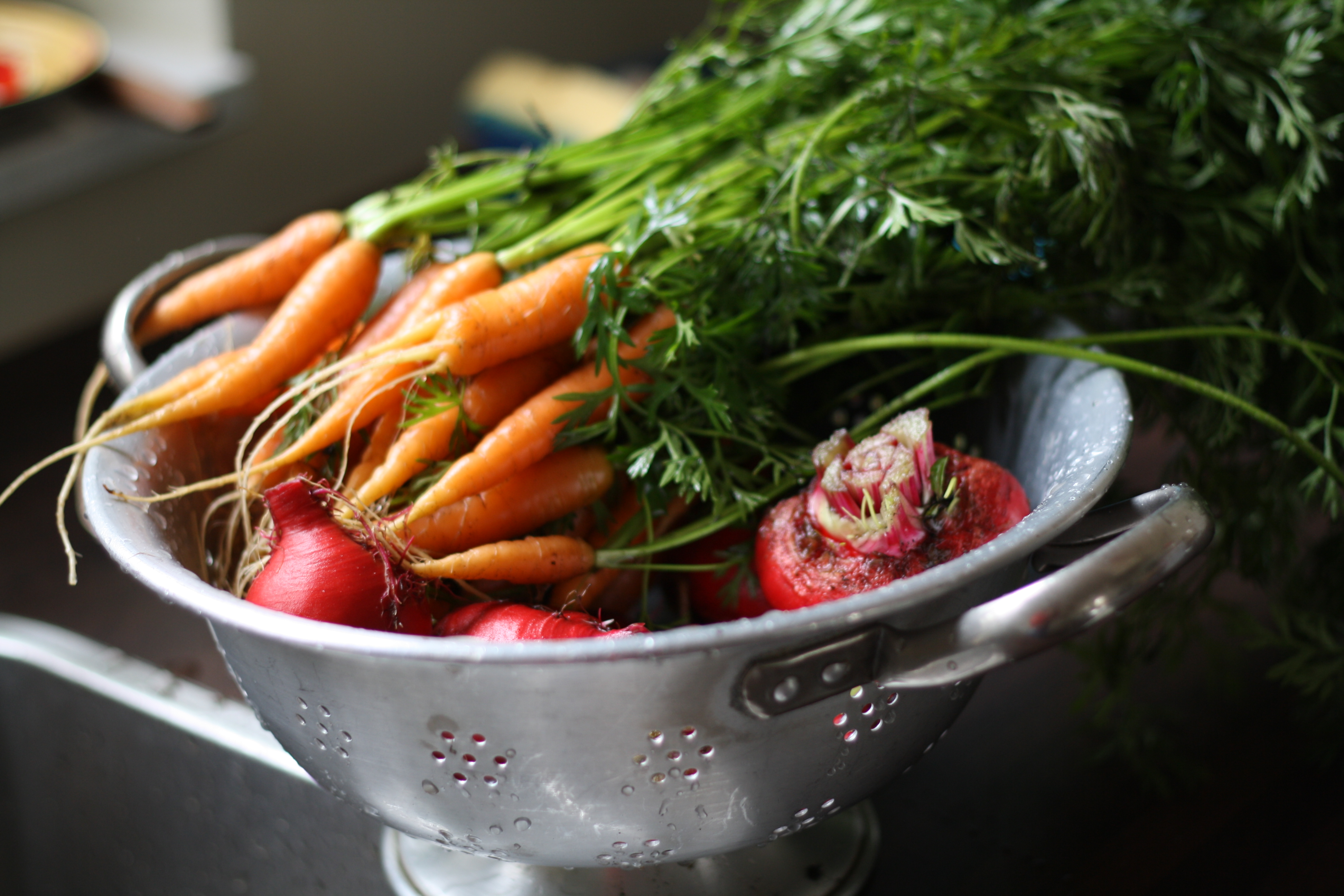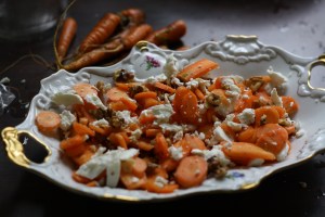 Foto linksonder: De worteltjes uit de moestuin zijn veel zoeter en smaakvoller dan uit de supermarkt. Haast zonde om te koken. Daarom eten we ze vaak rauw met wat geitenkaas en walnoten. Een hele goeie combi vinden we zelf. (zie foto linksonder)