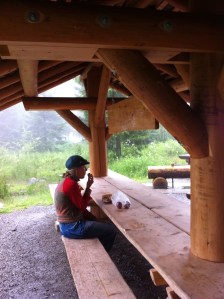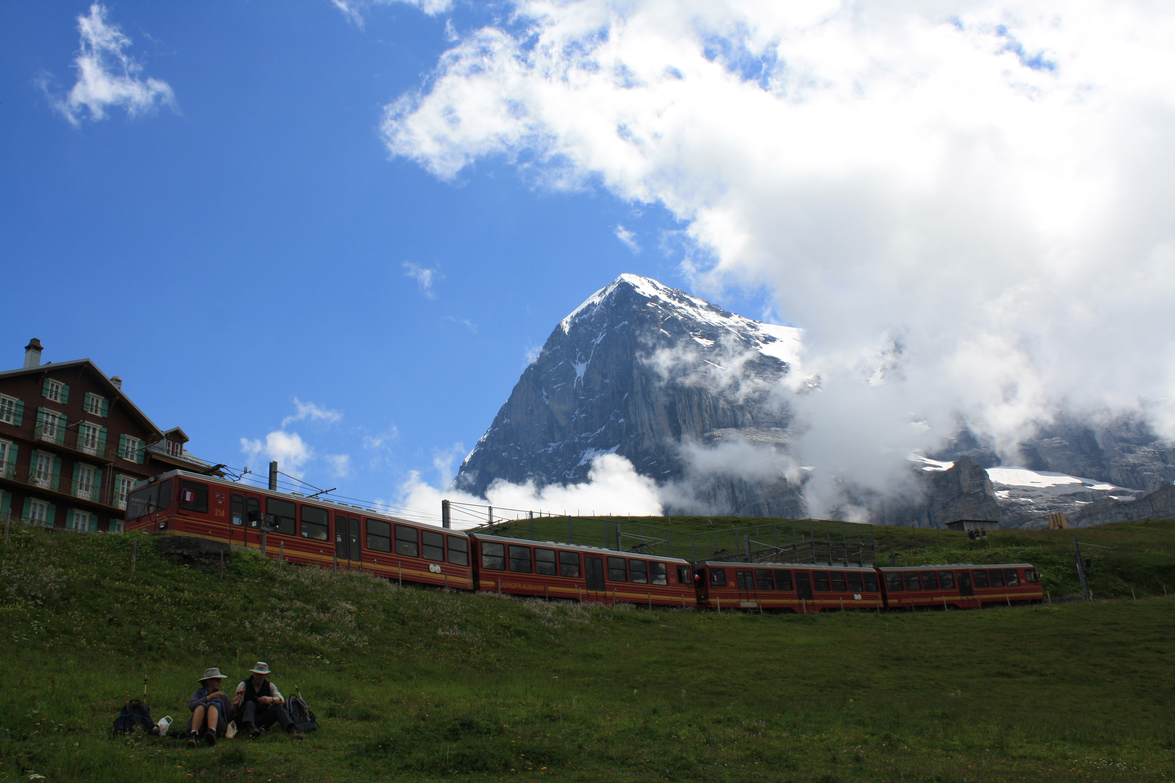 We hebben gekampeerd op camping Grassi in Frutigen (onder Interlaken). Hele mooie camping, liggend aan een rivier en je loopt zo vanaf de camping de bergen in. De laatste twee dagen logeerden (heel decadent) we in Gasthof Engelberg, net op tijd gevlucht voor het slechte weer. Wat een fijn gevoel om binnen te zitten, de tent droog in de auto te hebben liggen en wetende dat het op de camping noodweer is. Hoe bedoel je; leedvermaak? (de achtergrondmuziek van het filmpje – achter de link – is van de plaatselijke Jodelclub. Op onze laatste avond kwamen ze een biertje drinken in de Gasthof en gaven ons een privé voorstelling. Geweldig hoor, zo’n stoere groep bierdrinkende mannen, die opeens meerstemmig begint te zingen.