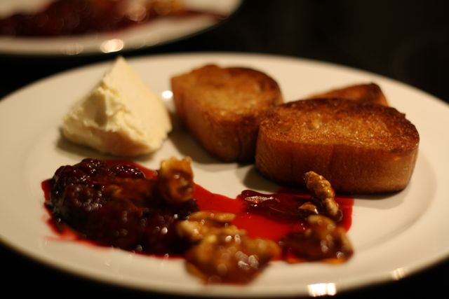 Sander verzorgde zaterdag een chic buffetje met allerlei lekkernijen en een rode wijn. Het meest bijzondere was het gerechtje van geitenkaas met bramensaus (met honing en rozemarijn) en gekarameliseerde walnoten met geroosterde ciabattabrood. Alsof er een engeltje over je tong piest fietst 😉