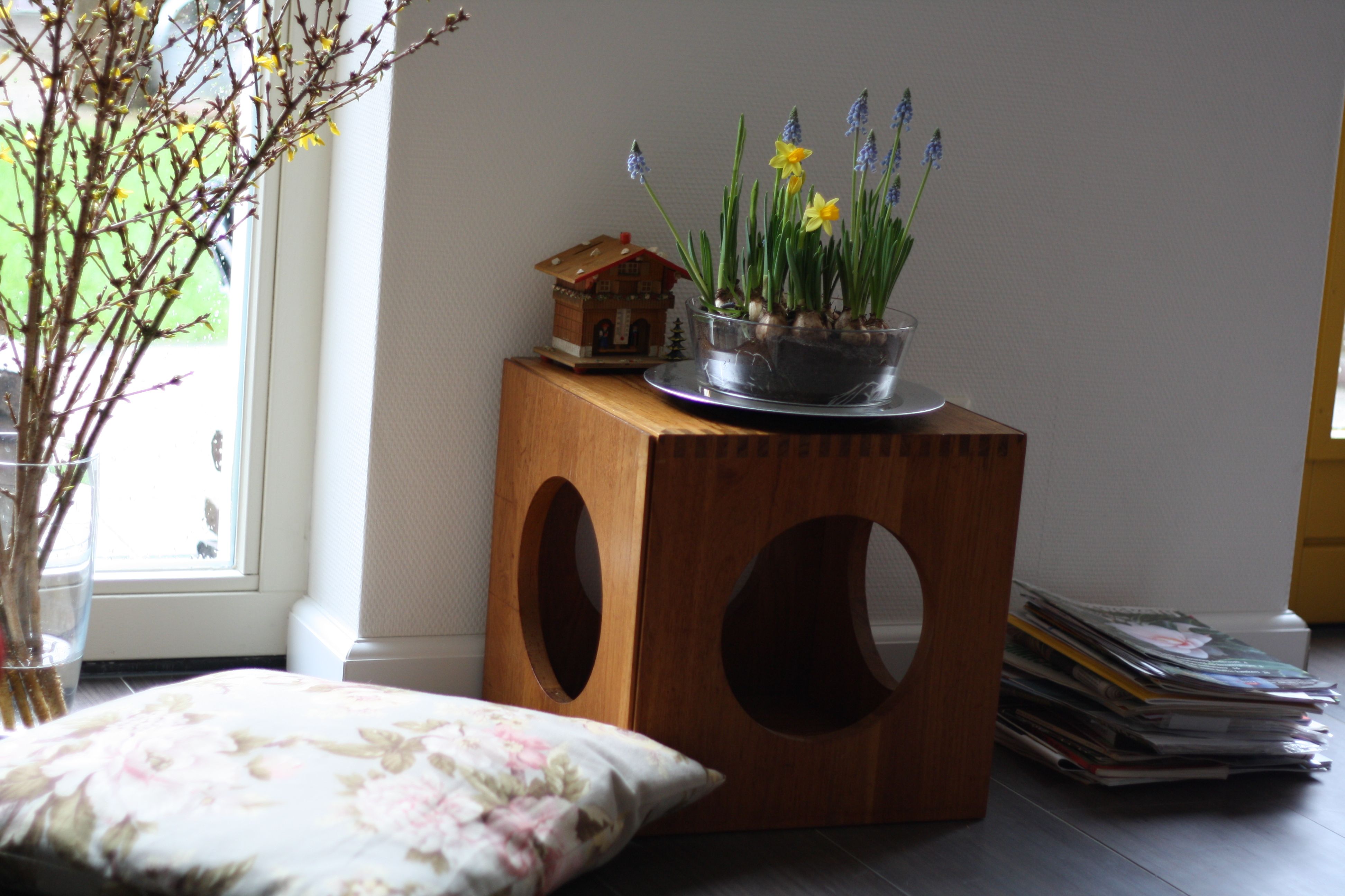 Voorjaarsbolletjes, elk voorjaar weer een feestje! Of is het nog geen voorjaar? De Forsythiatakken bloeien uitbundig geel. (2 weken geleden gekregen van Martijn en Moniek). Hierbinnen is het dus voorjaar…