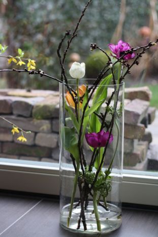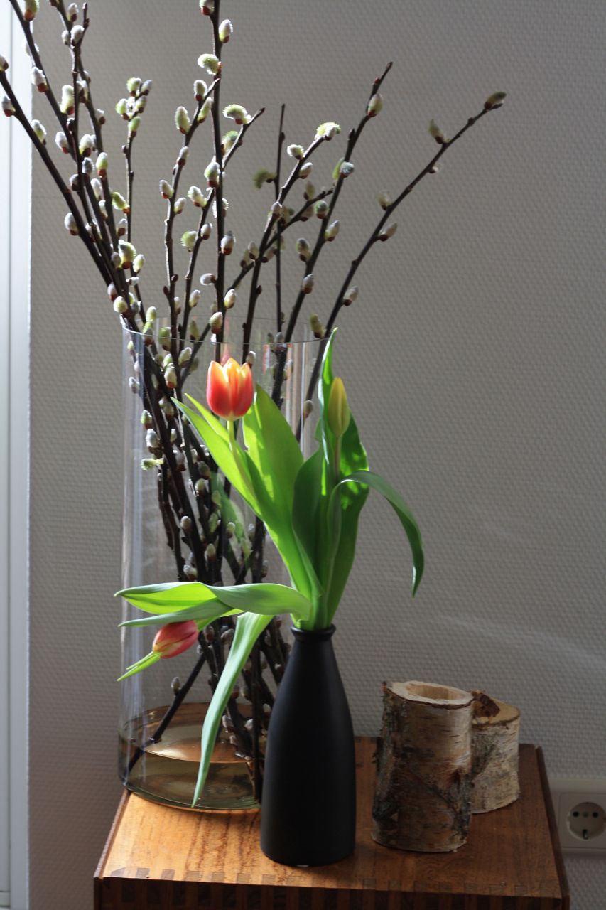 Ik fietste zonder sjaal en ging bij de buurtjes langs, zonder jas. Het was hier vandaag warm en zonnig en met de tulpen en katjes op de vaas, voelt het hier helemaal lente.