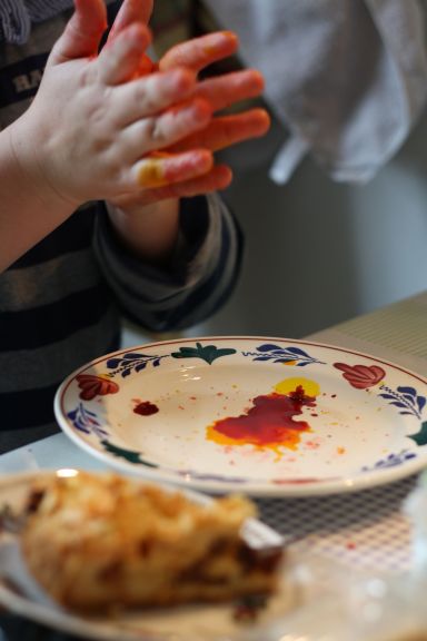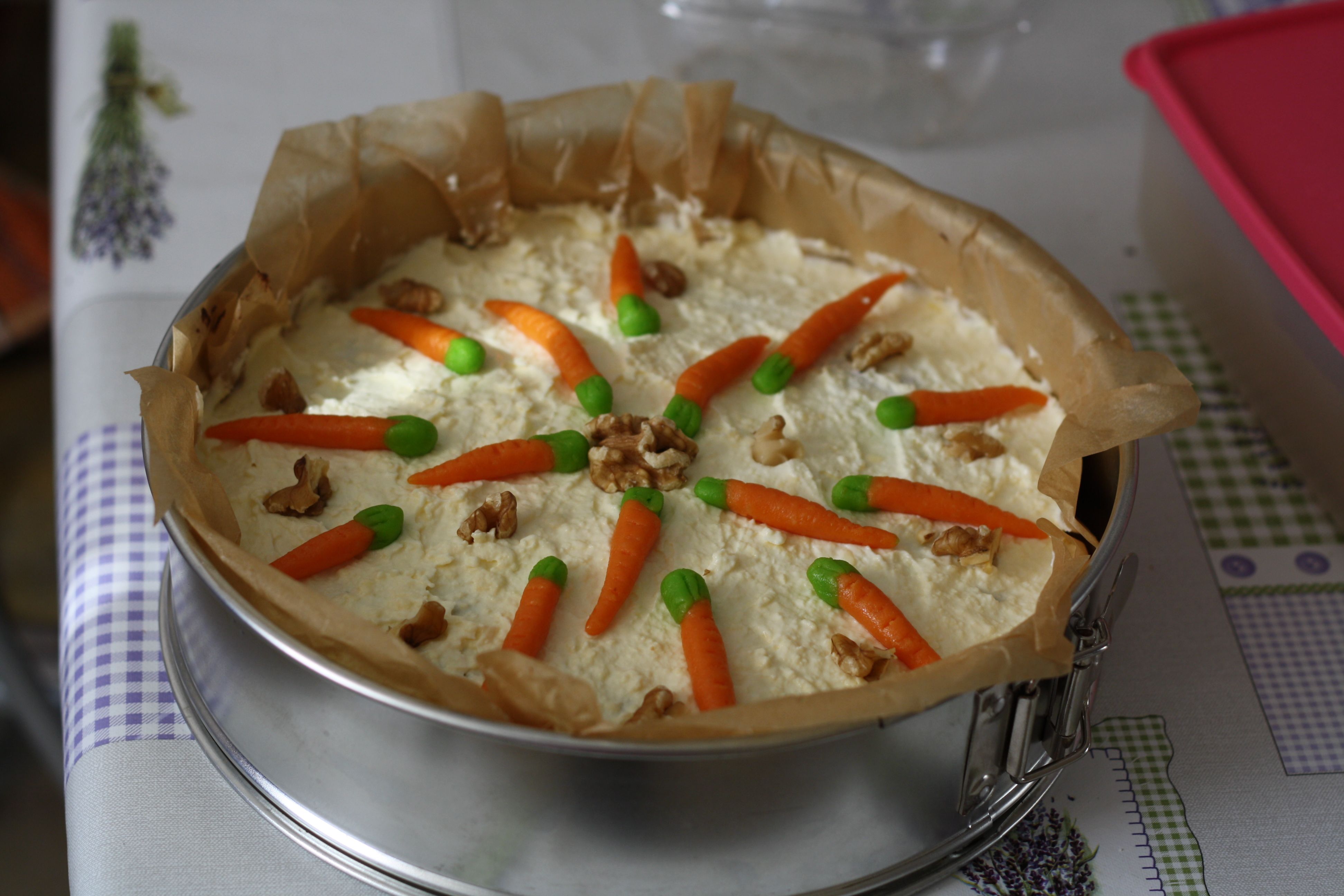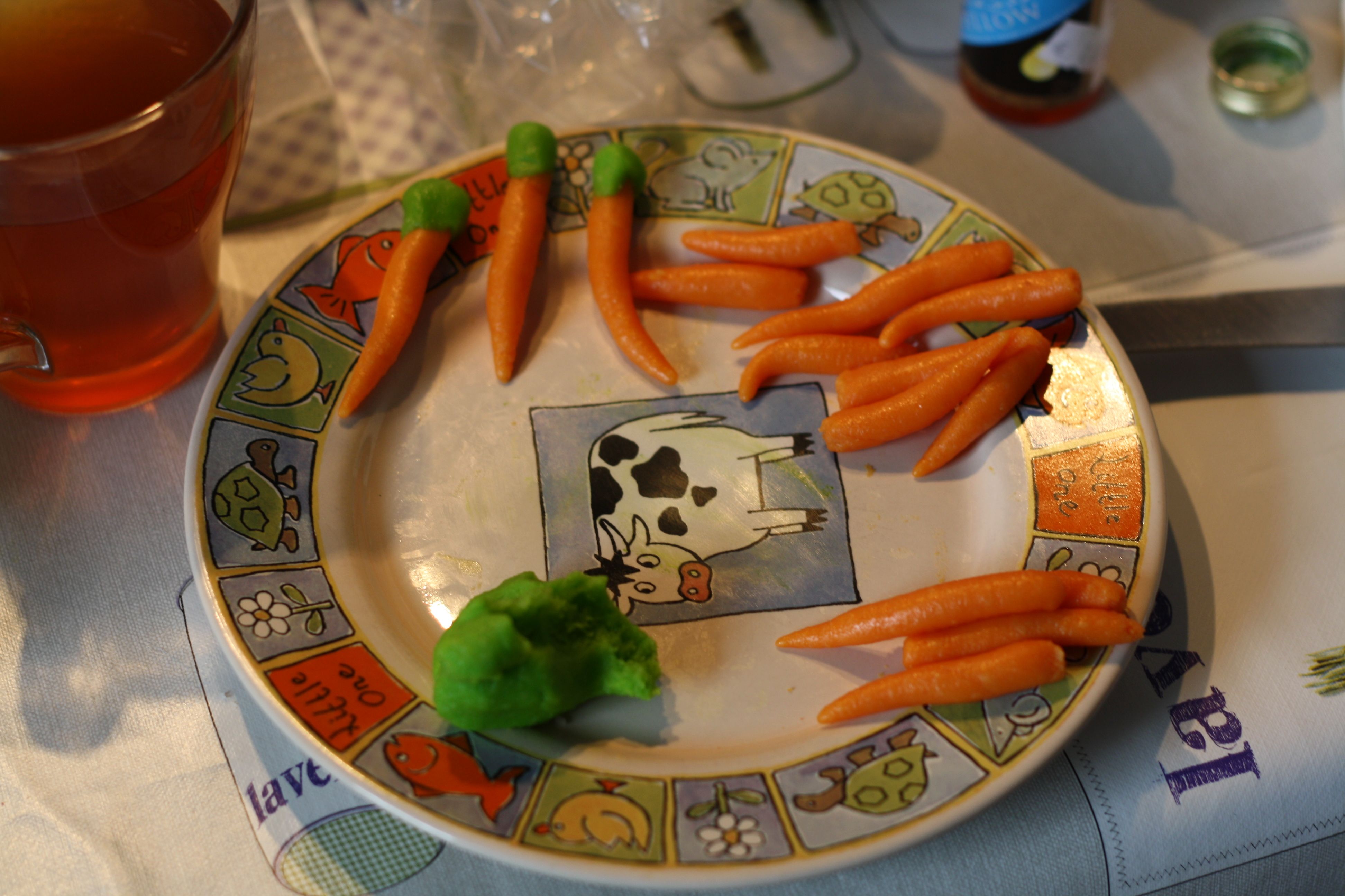 Vorig weekend waren we bij mijn ouders en maakten worteltjestaart voor de verjaardag van m’n zus Annemiek. Mijn neefje Mitchel hielp me met het kleuren van de marsepein en schoot zo nu en dan een beetje uit. Met als gevolg dat niet alleen de marsepein oranje werd. 🙂