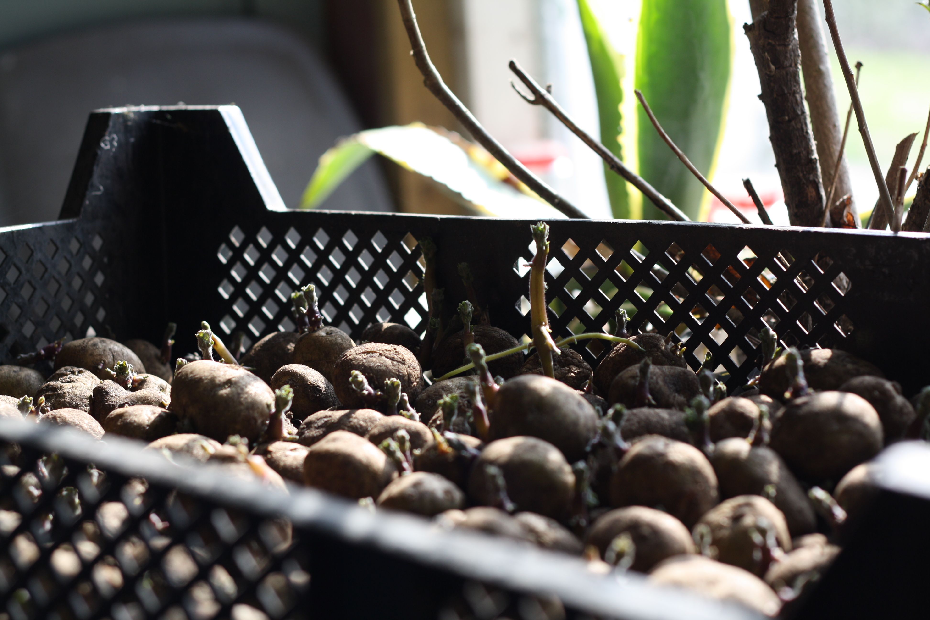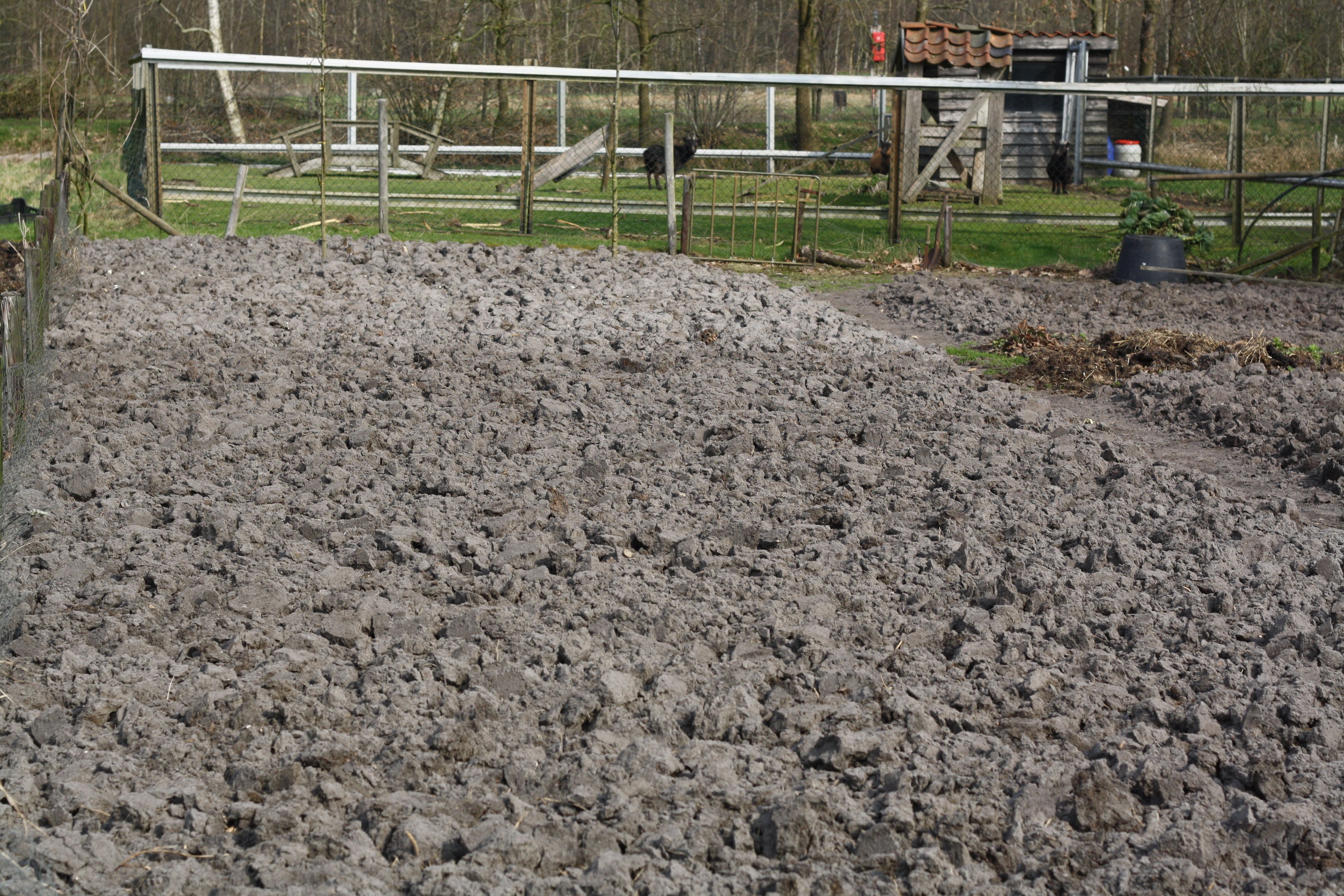 De moestuin ligt er leeg en nietsvermoedend bij. (De laatste spruiten gingen er afgelopen weekend uit, waarna Hendrikus er paardenmest op gooide en de grond omspitte.) Ondertussen worden er snode plannen gesmeed; de pootaardappels liggen klaar om de grond in te gaan en in de kas staat de eerste plantjes boven de grond.