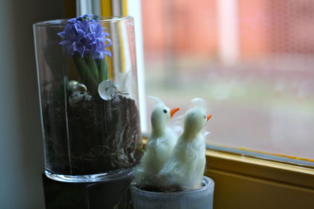 Tijdens mijn dagelijkse fietsritje (naar m’n werk) kijk ik altijd graag bij de mensen naar binnen. Leuk hoor, al die paastakken en broedende kipjes voor het raam! Bij ons pronkt momenteel een blauwe hyacint (gekregen van buurvrouw Hester) vergezeld door 2 loerende kuikens.