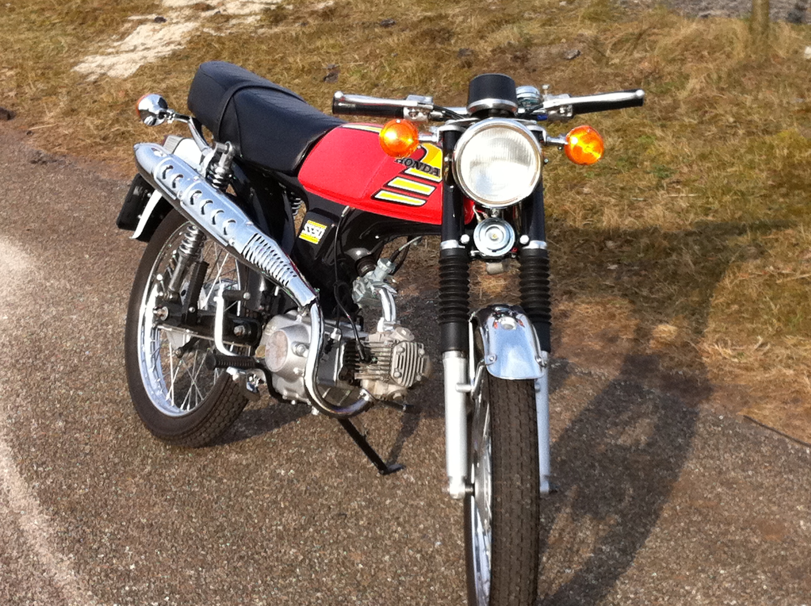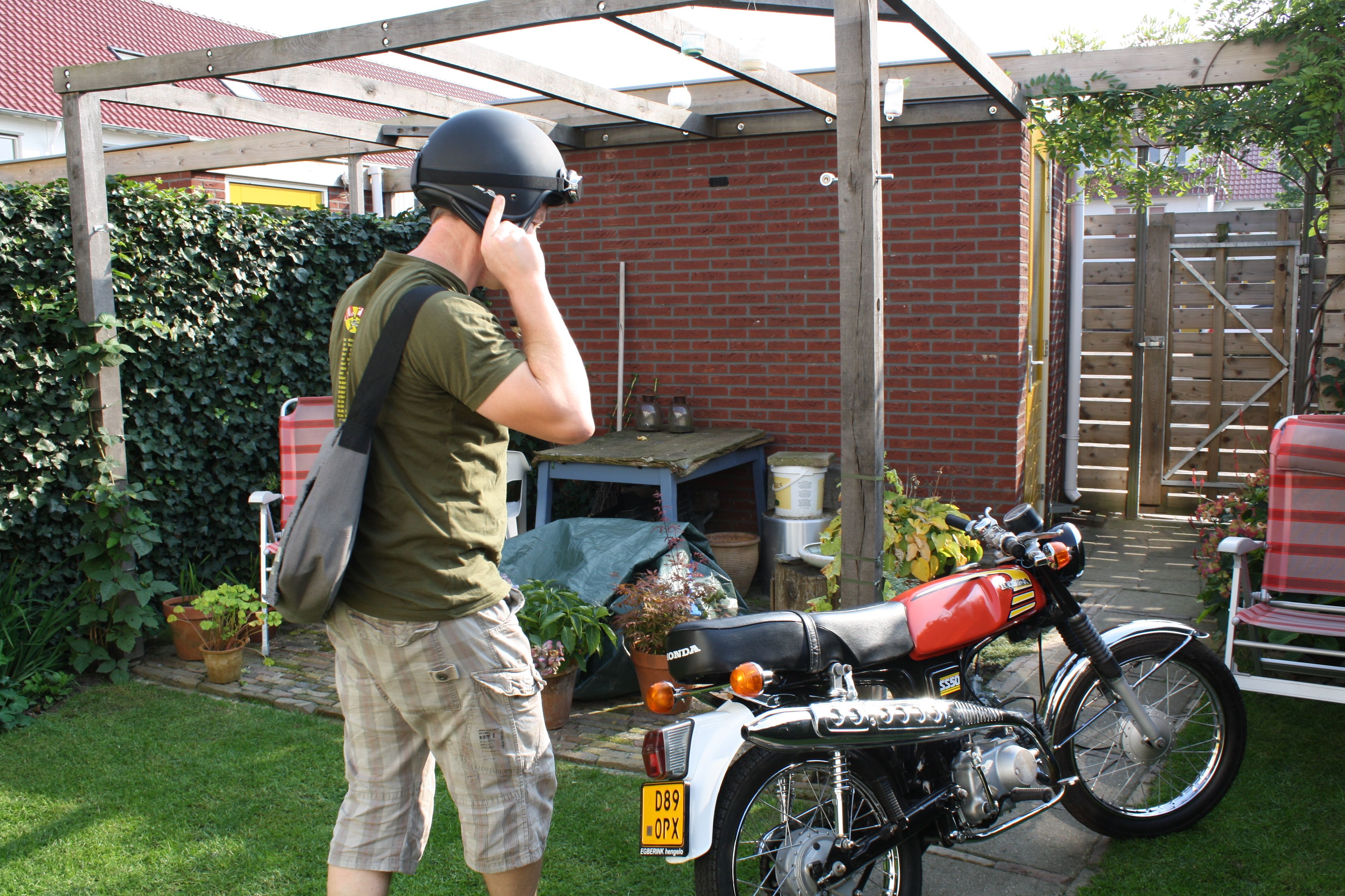 Afgelopen paasweekend bekeken we oude dia’s in Tiendeveen. Hoewel Hendrikus er weinig fiducie in had, bleek de lamp van de diaprojector het toch nog te doen. Naast vakantiekiekjes en verjaardagsplaatjes stuitten we ook op een foto met Sander op z’n oude brommer. Bingo! Hier was hij een jaar naar op zoek (en was in de veronderstelling dat het een foto was ipv een dia). Dus bij deze het bewijs dat Sander zo’n 20 jaar geleden ook al op dit brommertie rond reed! In het najaar van 2009 haalde hij zijn Honda SS50 verroest onder een afdakje weg en knapte hem (met behulp van kenners) helemaal op. (blok gereviseerd, opnieuw verchroomd, nieuwe wielen, tank en frame opnieuw gespoten, nieuwe buddyseat) Het leuke is dat hij al doende steeds wat bij leert en zich langzaam begint af te vragen of een carrière als brommermonteur voor hem zou zijn weg gelegd. 🙂