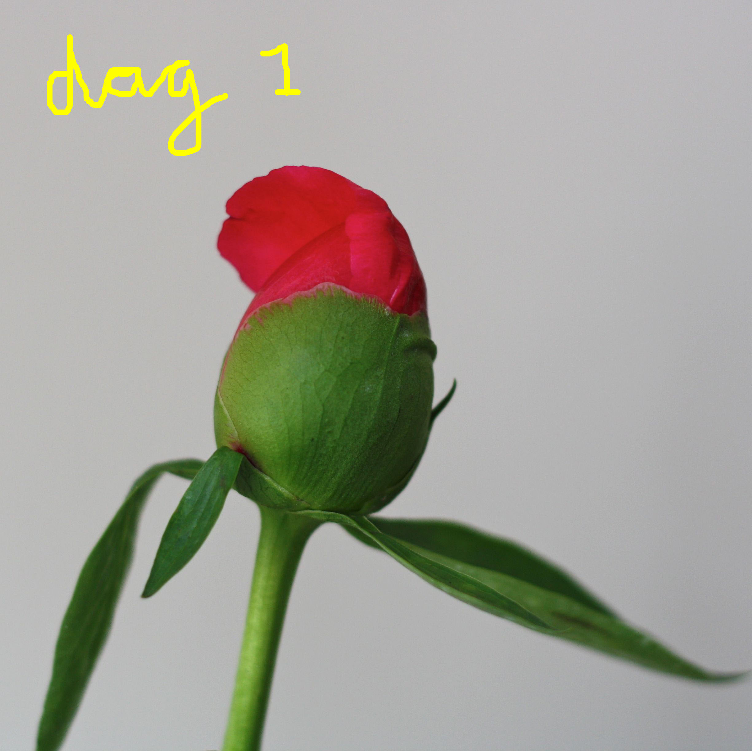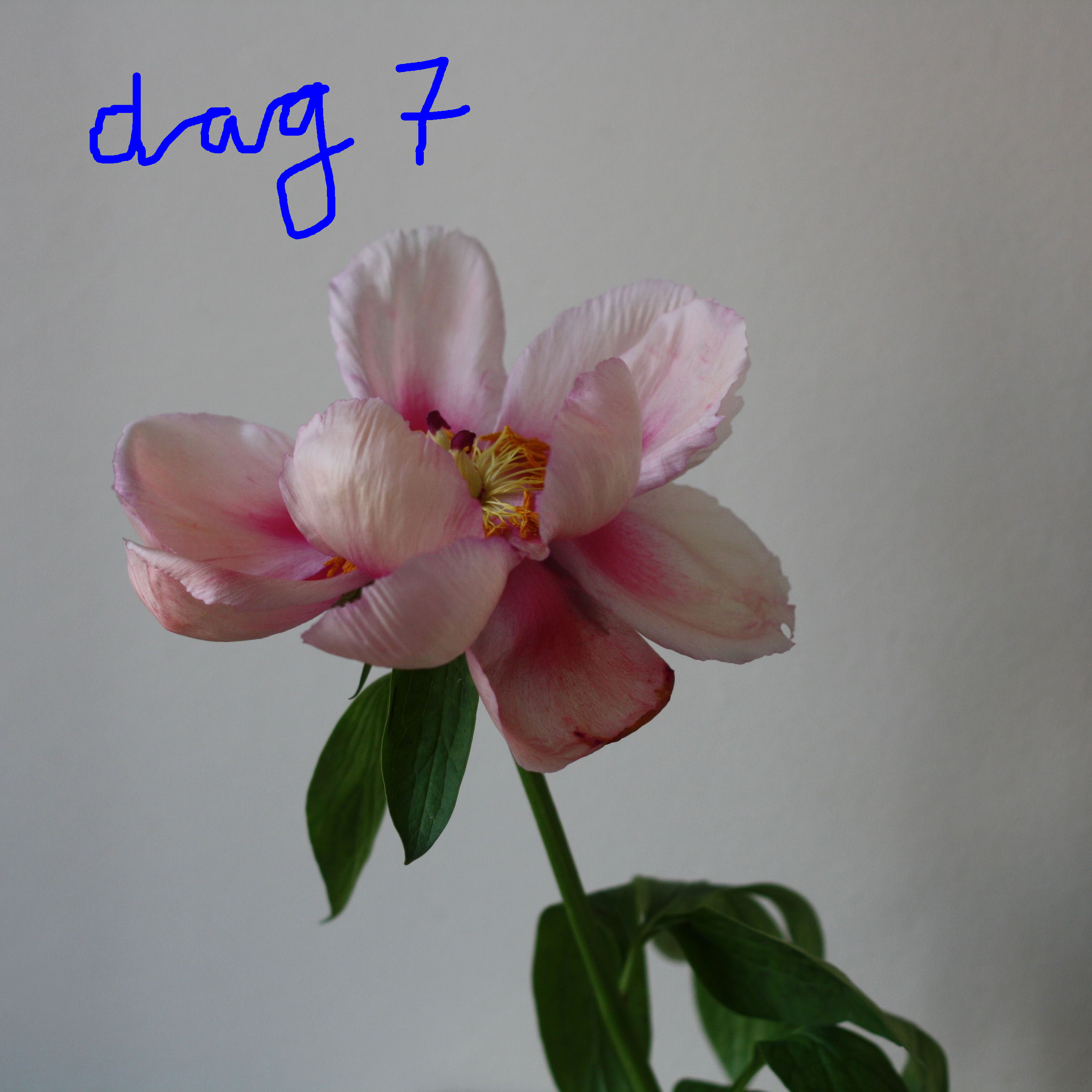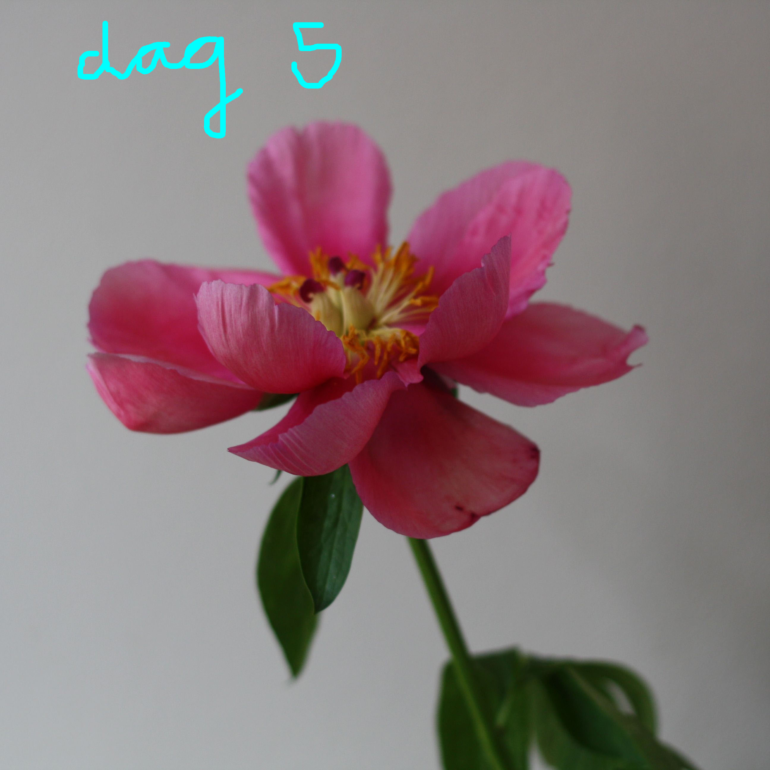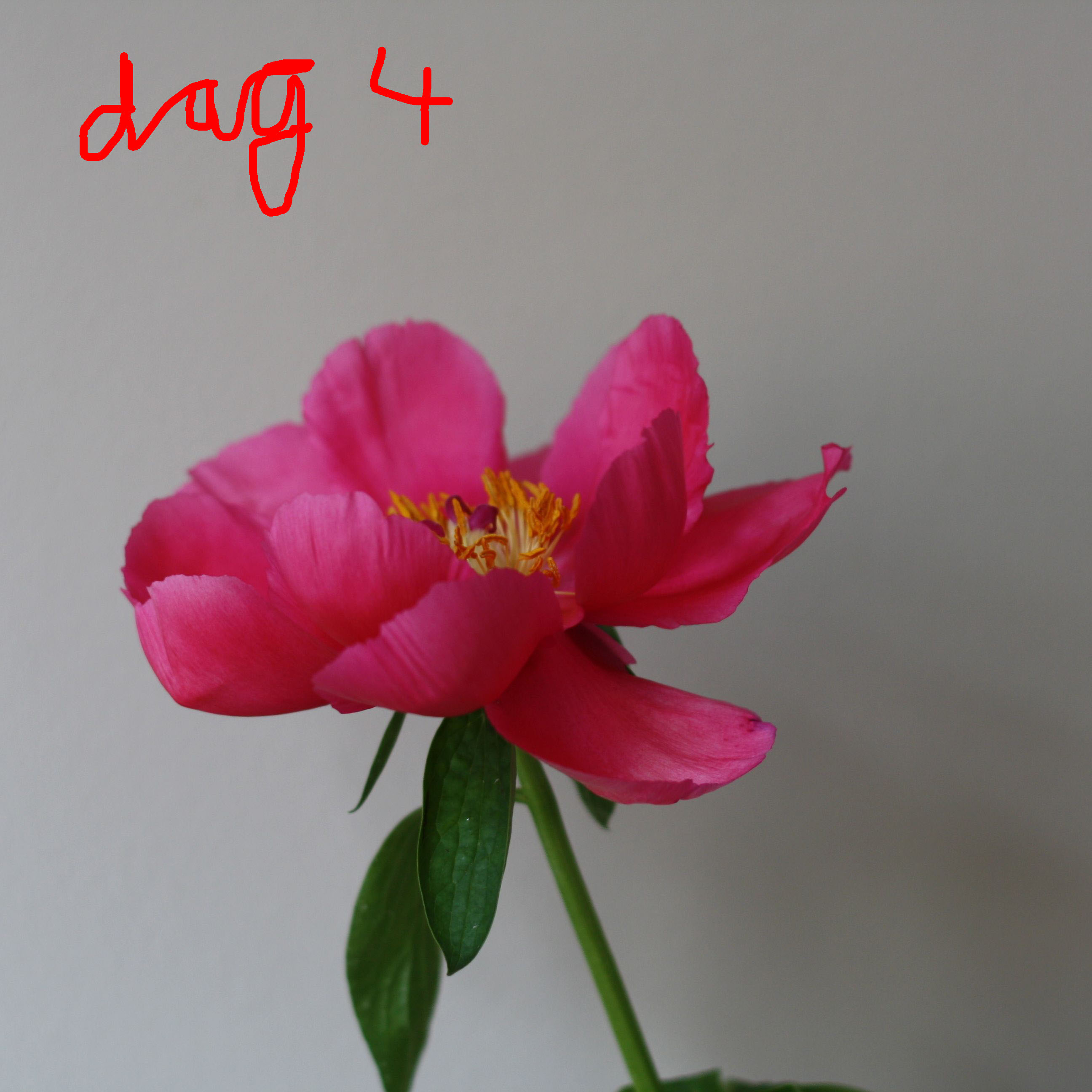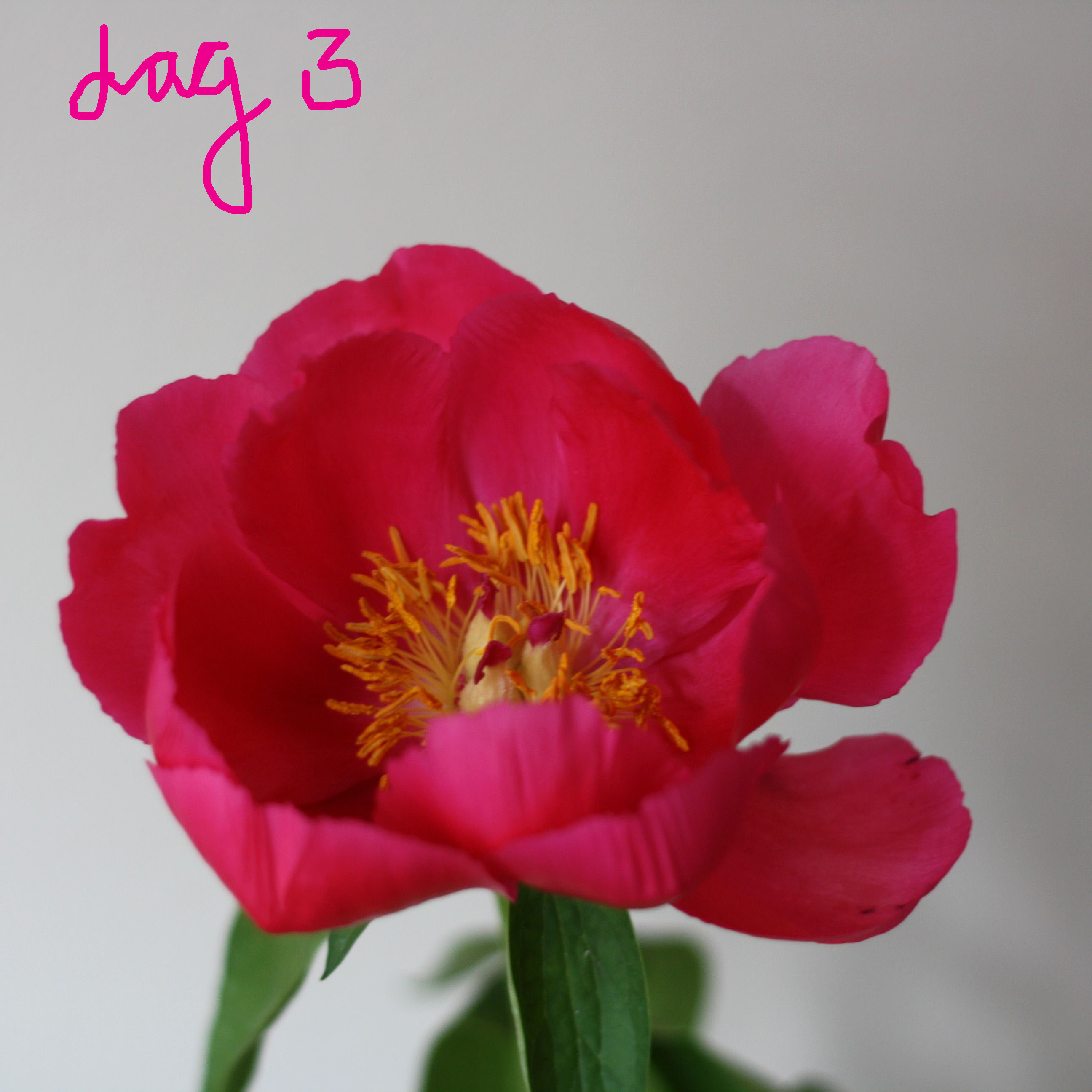 De eerste pioenrozen van dit jaar (bij de bloemist) kon ik niet laten staan. Ik kocht een bos voor mijn collega en nam er 1 extra mee voor mezelf. Ik kreeg het advies dat als de knoppen niet uit dreigde te komen, de knop zachtjes te masseren. Zoals je ziet kwam  zij volop open en showde een week lang haar uitbundige pracht. (Dit heeft vast te maken met mijn verfijnde massagetechniek, want dit deed ik natuurlijk zoiezo om er maar zeker van te zijn dat ze open zou komen 😉 )