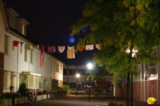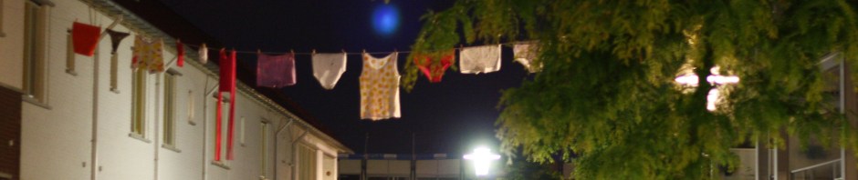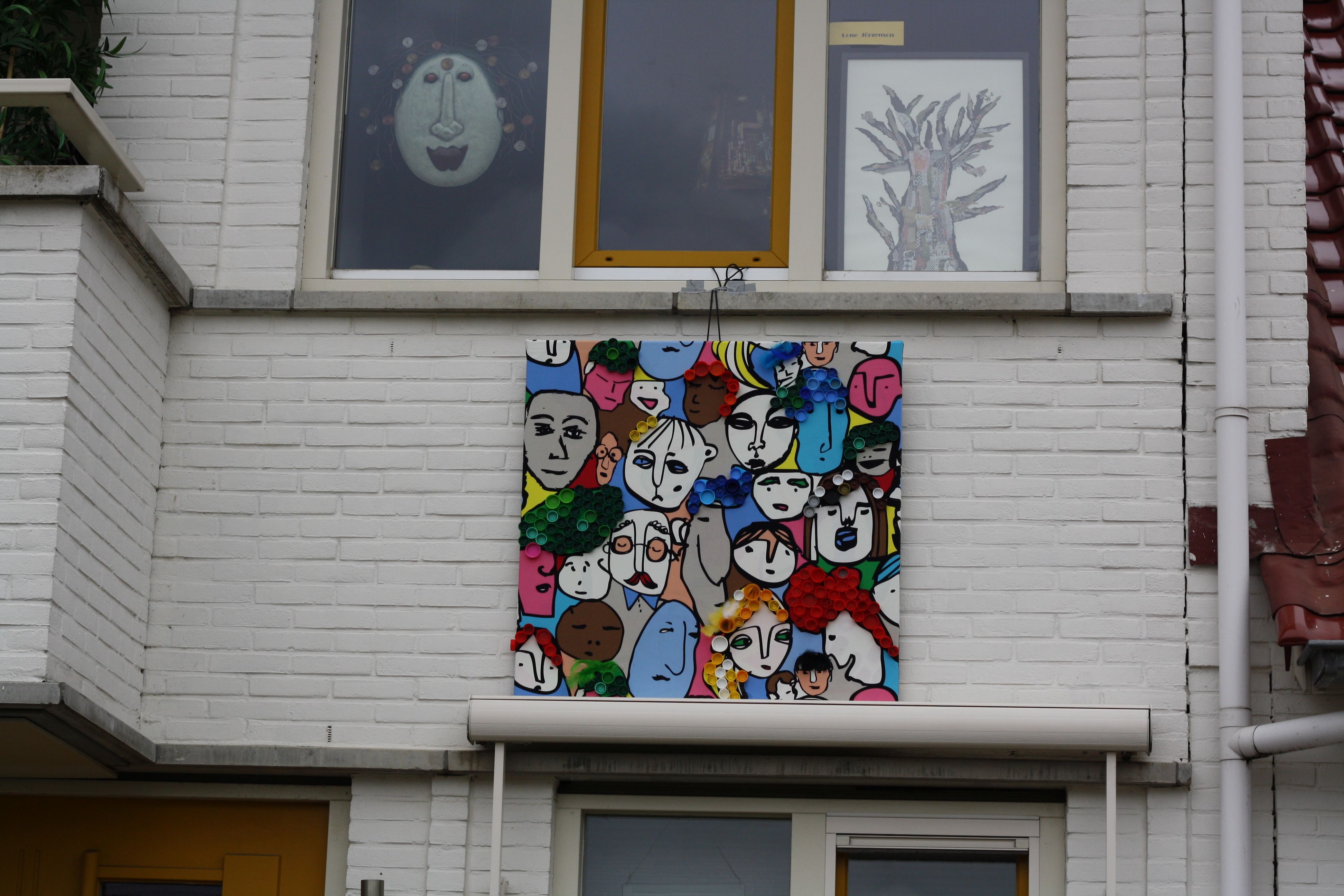 Zelfs het ophangen van “de kunst” bracht gezelligheid. Een nieuwe bovenbuurvrouw stelde haar balkon ter beschikking voor het ophangen van de waslijn, een andere buurvrouw kwam met een oranje string aanzetten (in het kader van de voetbal) en de buurkindjes reikten de knijpers aan. Achteraf liepen we met een stelletje de kunstroute en dronken muntthee bij ons op de bank. De kunstroute is een initiatief van Josefien uit de Antoniusstraat ivm de week van de amateurkunst.