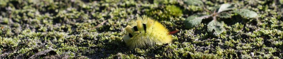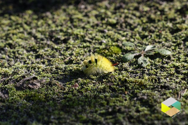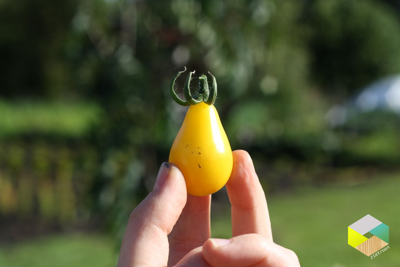 Je komt de modekleur geel ook overal tegen. Bovenstaande gele rups (meriamsborstel genaamd) liep doodleuk door de tuin. Nee, niet overgewaaid van één of ander subtropisch eiland maar gewoon thuis op de zandgronden in Drenthe. Het gele tomaatje doet ook leuk mee. Je kijkt je ogen uit in Tiendeveen.