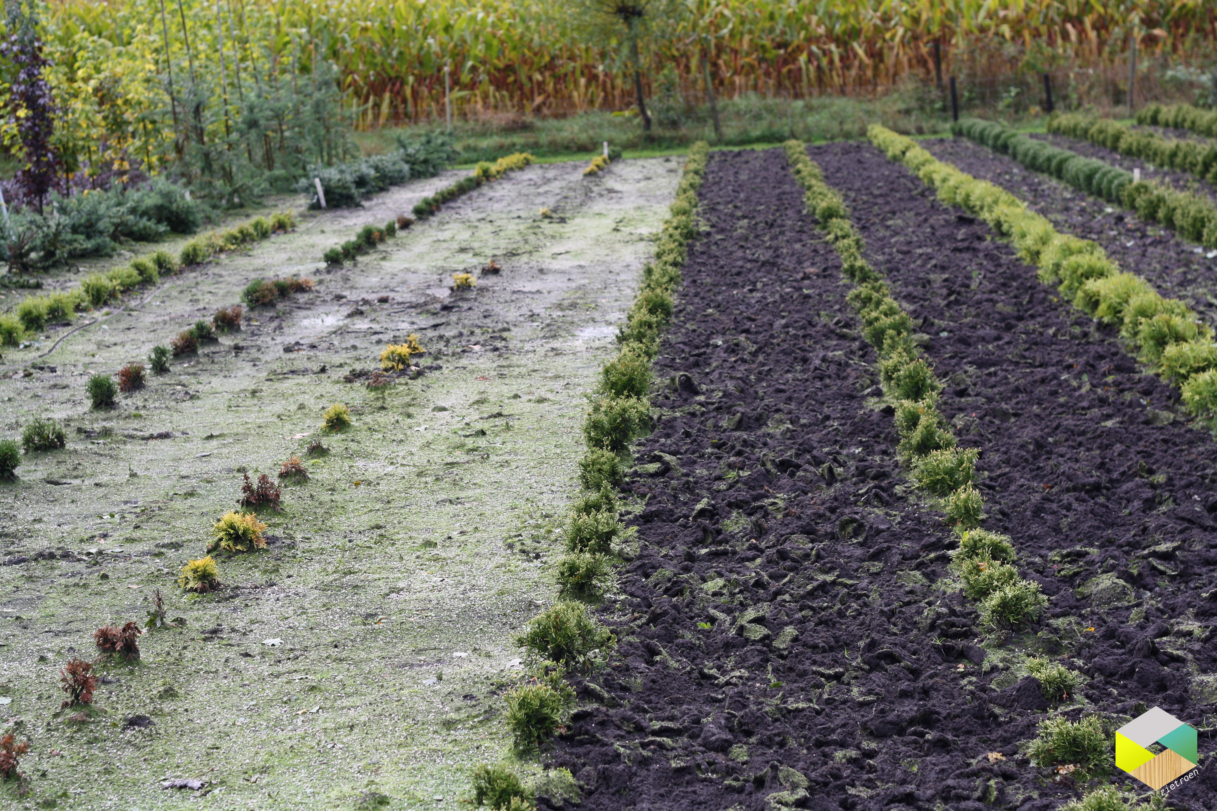 Vrijdagavond haalden we kleine kerstboompjes als nieuwe aanplant voor de kwekerij. Over een jaar of 3 klaar om in de huiskamer te pronken. Vooruitdenken is regeren, zullen we maar zeggen. (Dit jaar valt onze kerstbomenverkoop (en bakjes) op zaterdag 8, 15 en 22 december). Gelukkig stopte het zaterdag rond 12.00 u met regenen en konden we fijn naar buiten. Naast onkruid trekken, strooide ik kalk tegen mosgroei en trok de grond daarna los met een cultivatortje. Ja, ik leer er steeds wat bij. Lichaam moe, hoofd leeg… Wordt dus voorlopig weer niks met dat vooruitdenken.