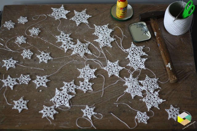 Aangezien het zo weer december is, zijn we al aan het voorbereiden voor onze kerstbomenverkoop (en -bakjes) in Tiendeveen. Naast het verzorgen van de bomen moet er natuurlijk wat gefeubeld worden. Ik haakte de afgelopen periode zo’n 40 sterretjes en heb deze ondertussen verhard met houtlijm (verdund met wat water) nadat ik ze had gespannen op een plank. De bedoeling is dat ik ze op een ijzerdraadjes zet en als duo (een klein en een groot sterretje) in een kerstbakje prik. Verder photoshopte ik een foto van een kerstboom in het logo (wat Miek maakte) van mini camping De Bulte. Ik denk dat ik er een aantal laat afdrukken en mee stuur met onze kerstkaartjes dit jaar.