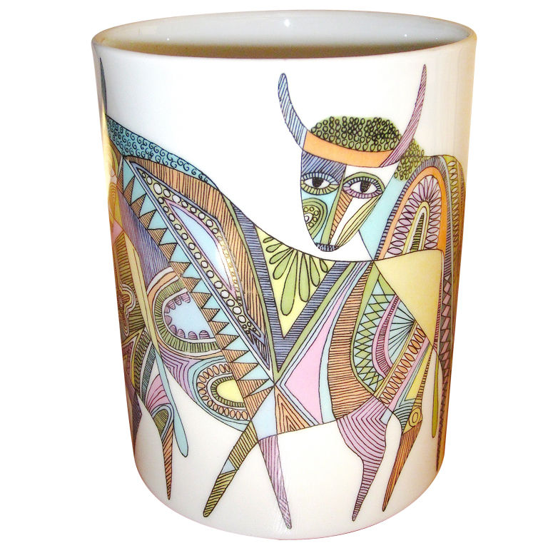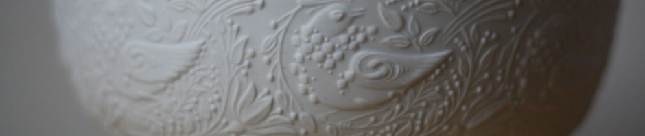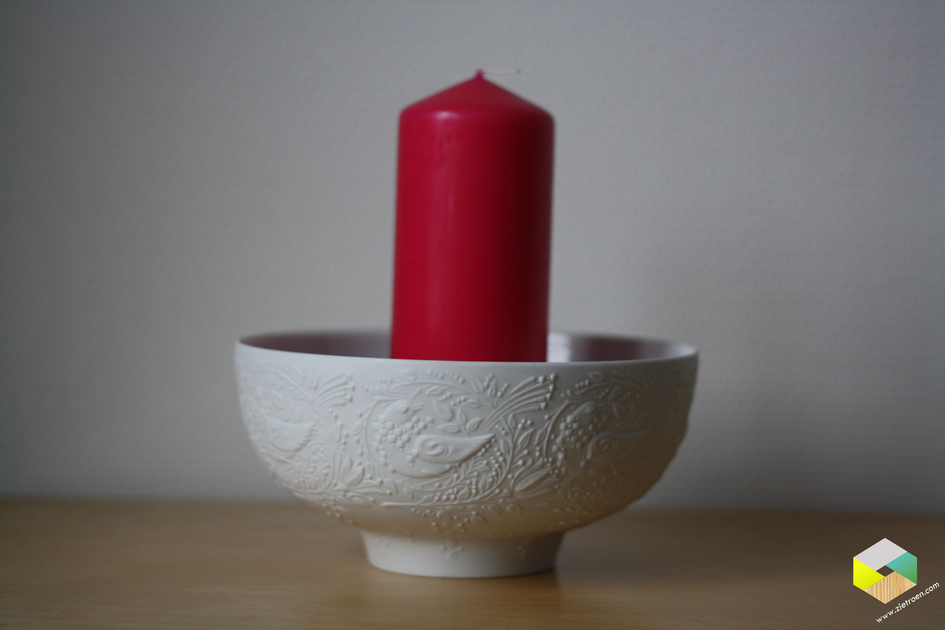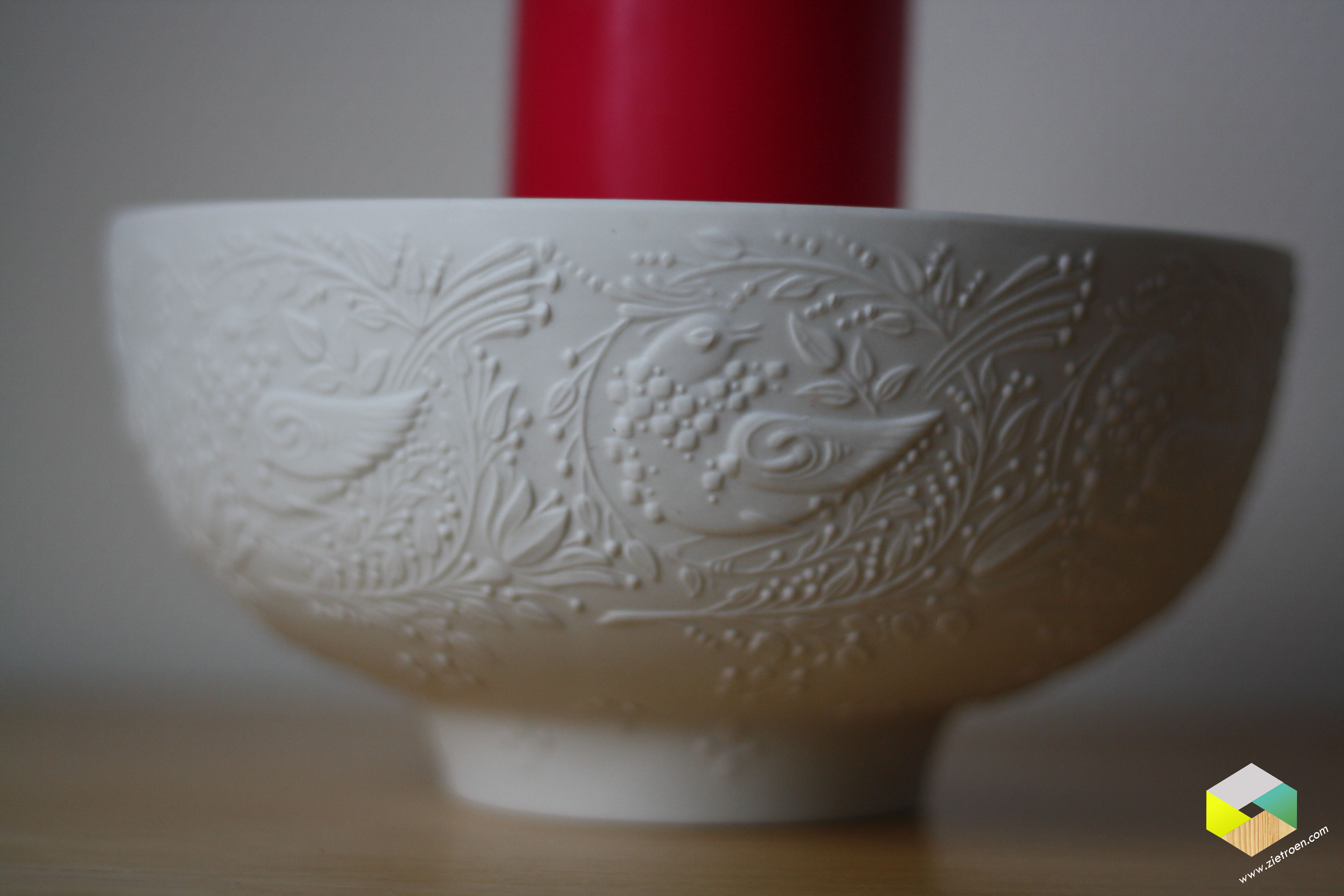 Toen ik deze porseleinen schaal zag staan op de rommelmarkt, maakte m’n hart een dansje. Wat een juweeltje! Zij is van het merk Rosenthal, op zich een doorgaans merk wat je vaak onder een kopje of schaaltje aantreft. Maar deze schaal is van de Deense (hoe kan het ook anders) ontwerper Bjorn Wiinblad, die heel wat pareltjes op z’n naam heeft staan zoals deze klik. Naast dit ingetogen, haast serene werk heeft hij ook hele expressieve, kleurige dingen gemaakt. Aangezien ik de schaal eigenlijk té mooi vind om te gebruiken en ook té mooi vind om in een kast te zetten, heb ik haar (ja het is een zij) cadeau gedaan aan m’n vriendin Bianca. Gelukkig is zij niet zo’n benauwde en serveerde ons er dezelfde avond zelf gemaakte appelmoes uit. Want laten we eerlijk zijn, het is natuurlijk gewoon een schaal 😉