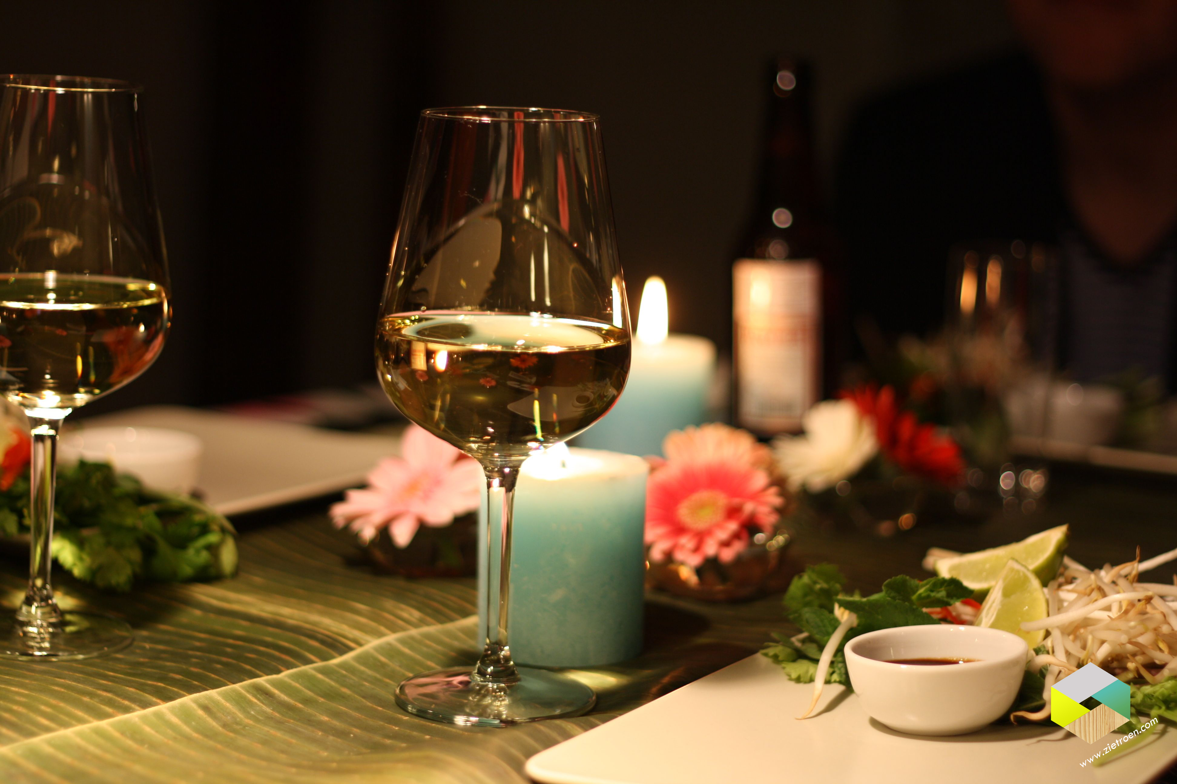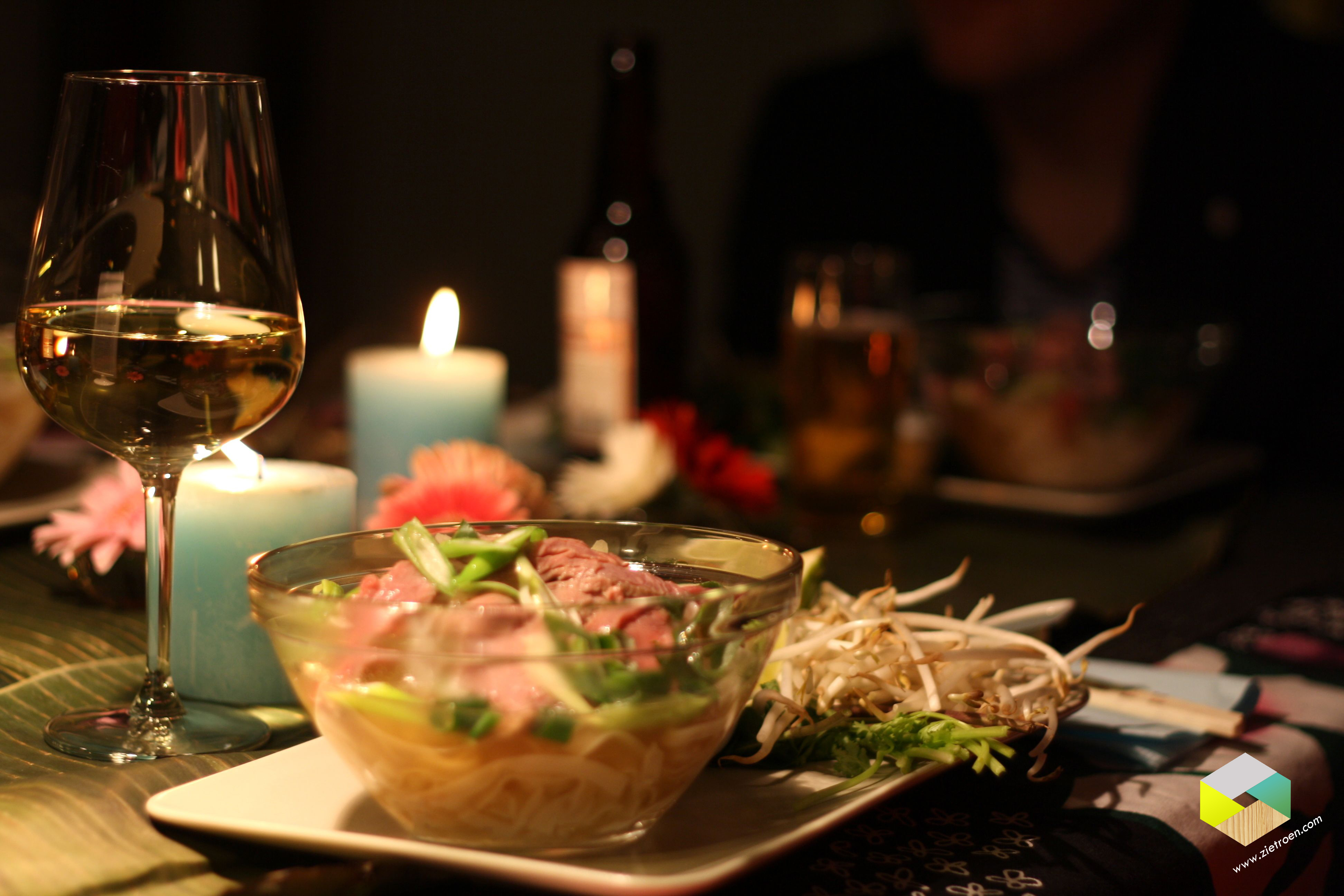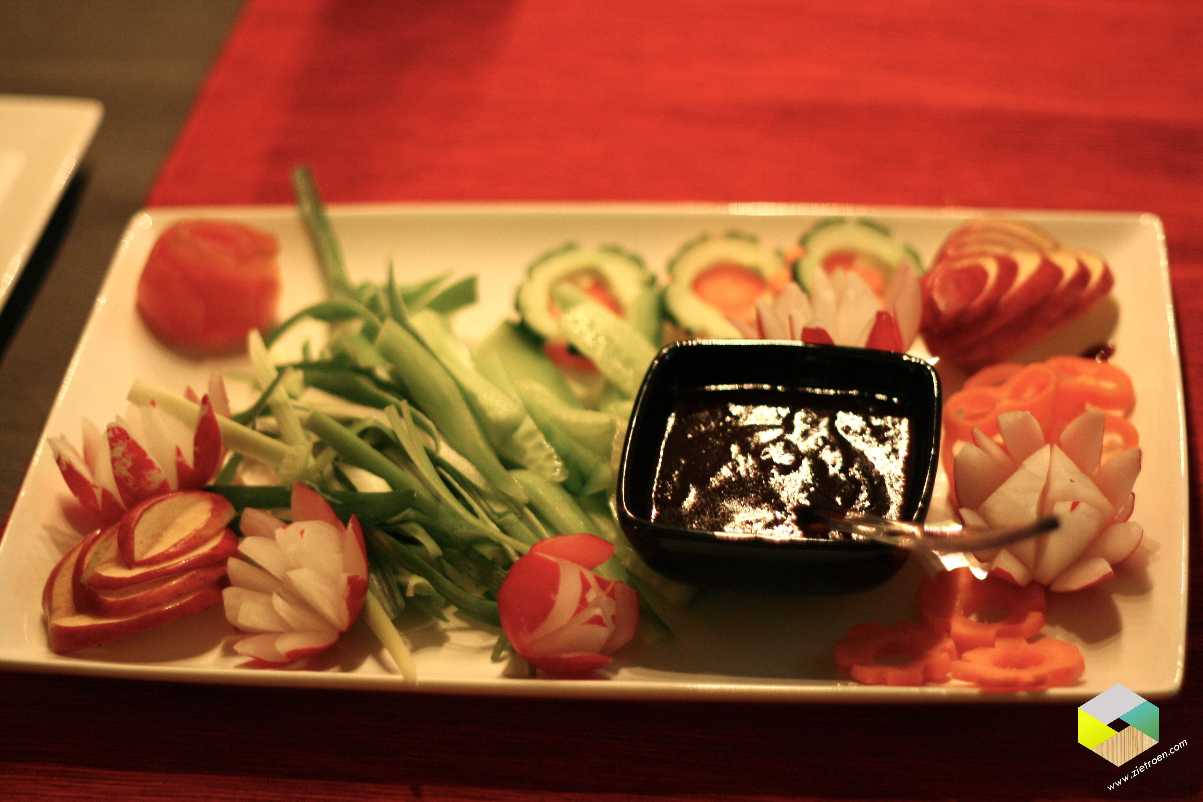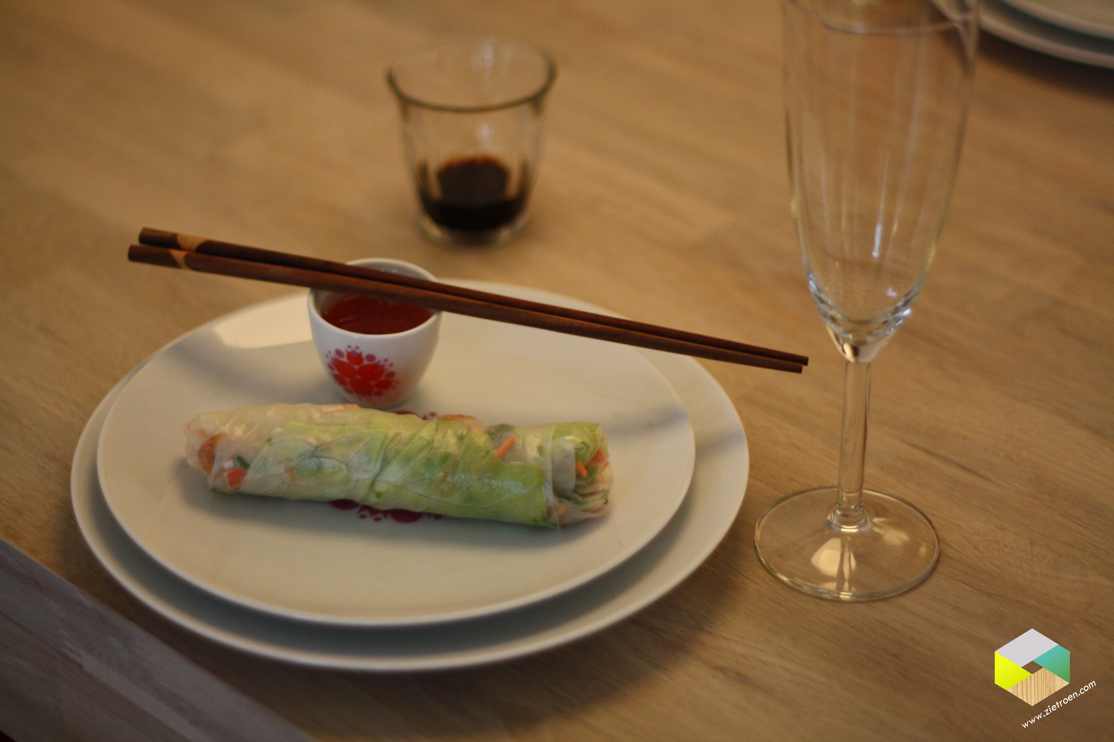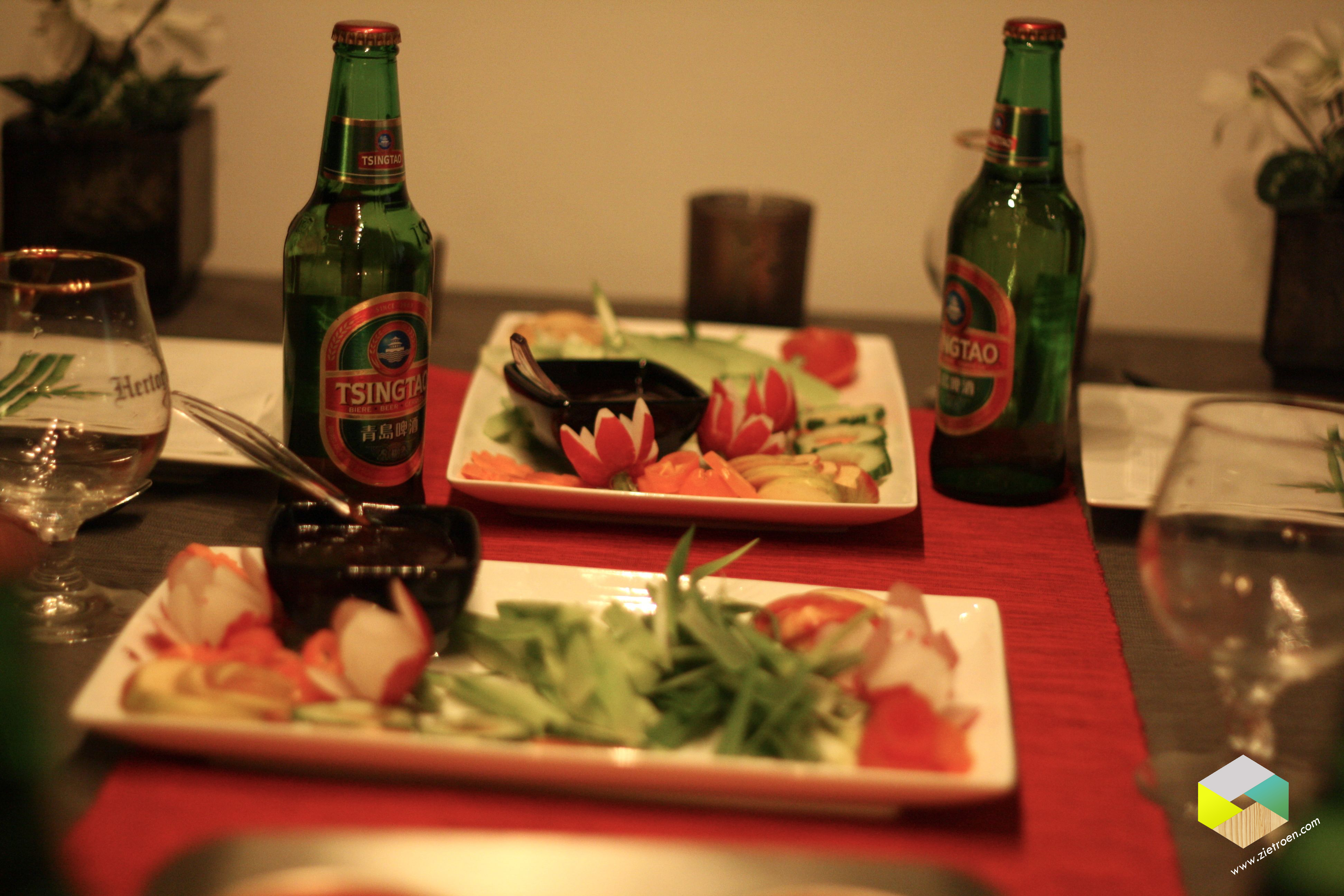 Koude voorgerecht bij Hester (verschillende soorten Sushi, gefrituurde garnalen in tempura beslag, gefrituurde kabeljauw balletjes, rol met groente en garnalen) warme voorgerecht bij Lone en Sanne (Vietnamese Pho Bo = soep met noodles, rund en allerlei kruiden en specerijen) hoofdgerecht bij Marjan en Rob (Pekingeend in pannenkoekjes) dessert bij ons (Mango jelly, Lychee perfection, Pandan Chiffon cake en limoen mousse)
