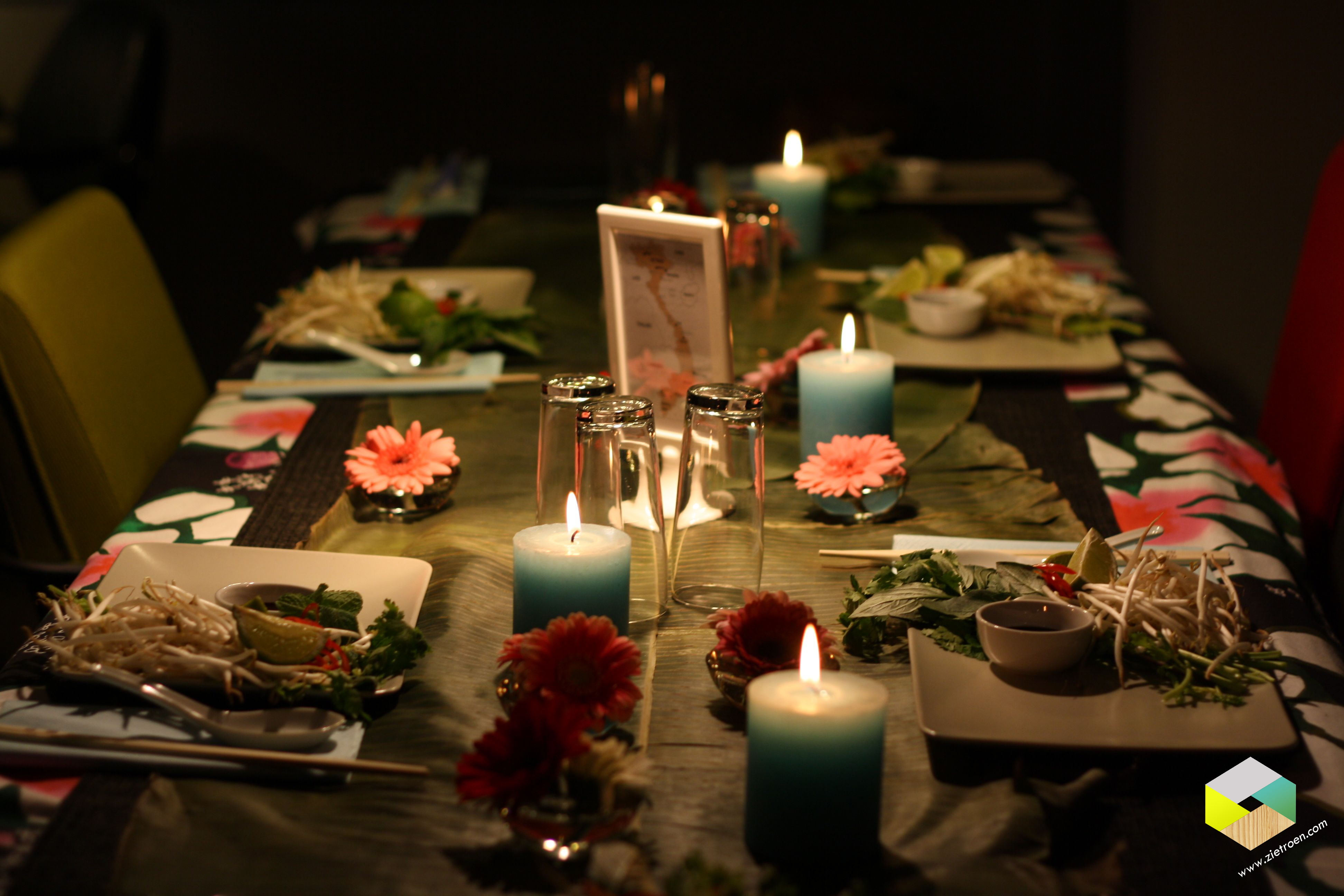 Samen eten met een 7 mensen uit de buurt (4 huishoudens). De één maakt een koud voorgerecht, de tweede een warm voorgerecht, de derde het hoofdgerecht en de laatste het dessert. Iedereen serveert dit in z’n eigen huis, waardoor we tussendoor dus steeds van huis naar huis lopen. Dit doen we 2 twee keer per jaar. Thema deze keer was Azië.