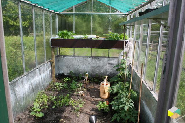 in de kas, met rechts de komkommer- en tomatenplantjes