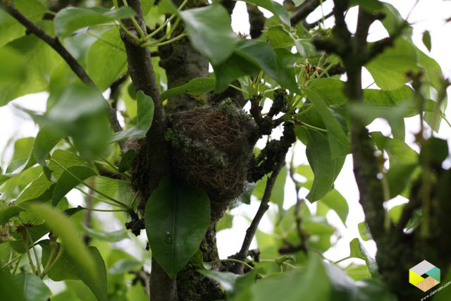 Een heel klein nestje in de pruimenboom, waarschijnlijk van de bonte vliegenvanger