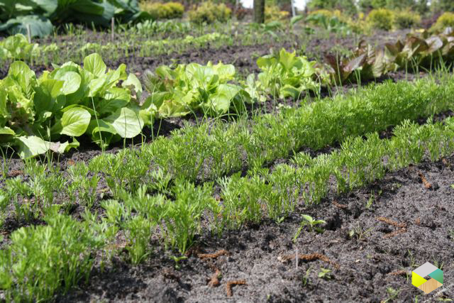 De moestuin ligt er heel mooi bij. De aardappels groeien als een tierelier, net als de sla, de tuinbomen en de uien. Grote winnaar is de rabarber, die grote bos, rechts voor de kas.