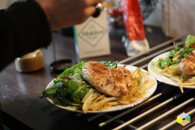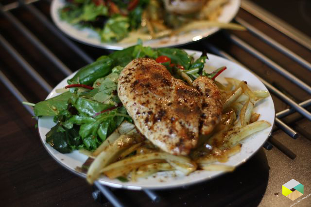 gebakken kip met dropppoeder op bedje van venkel, daarnaast een salade met munt, basilicum, olijven en citroen