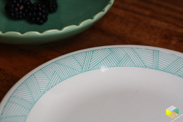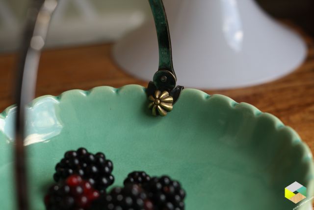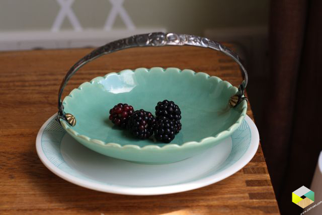 Op de rommelmarkt kocht ik een schaaltje met hengseltje en 6 ontbijtbordjes met een groen randje. Ik wilde het schaaltje eigenlijk iemand cadeau geven, omdat het bijna te mooi is om te gebruiken (door mij) maar Sander wees me erop dat het ooit heel mooi zal staan in onze theetuin. Het wordt dus een keepertje…