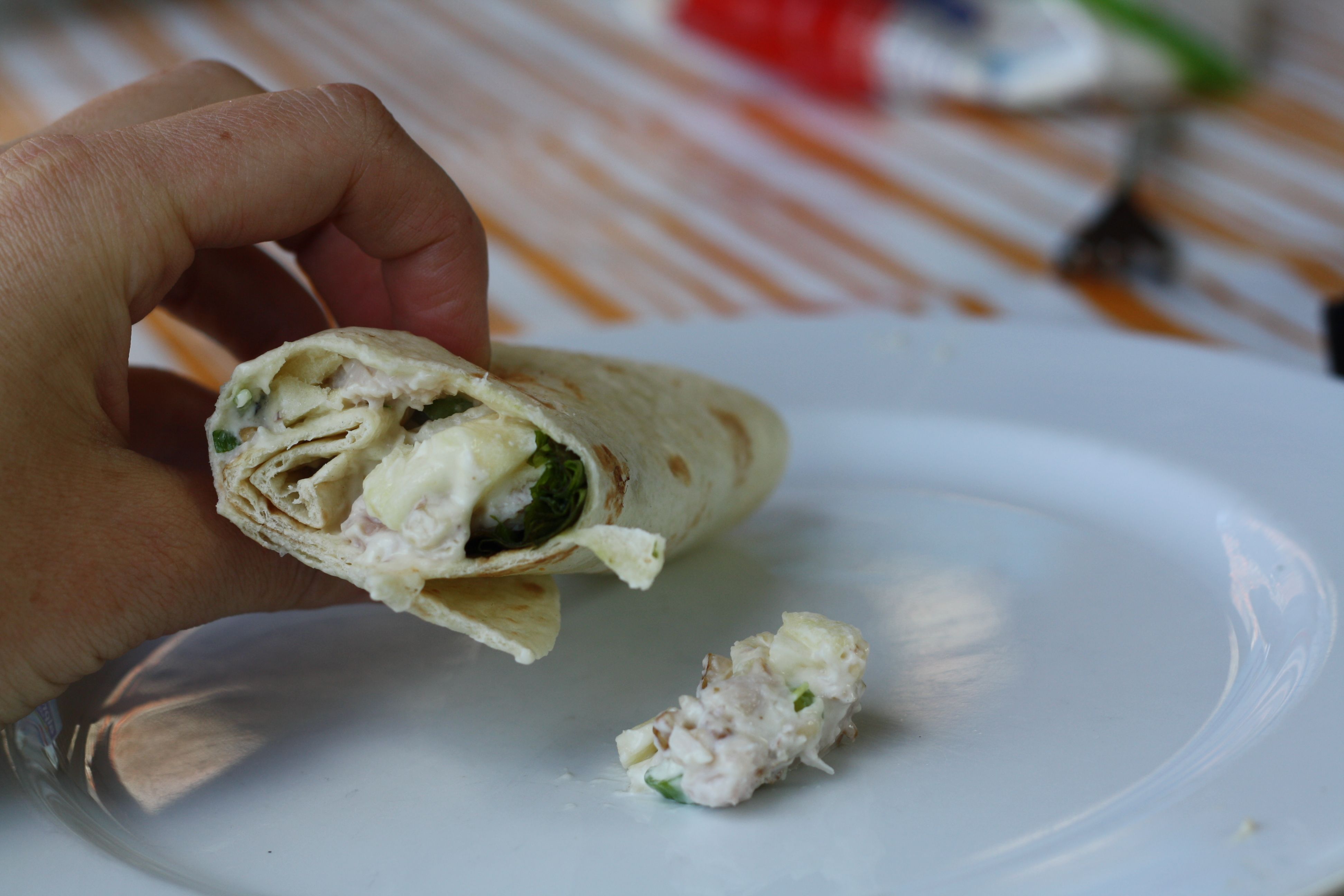 wrap met gerookte kip, zure appel, walnoten, mayo, lente ui en creme fresh
