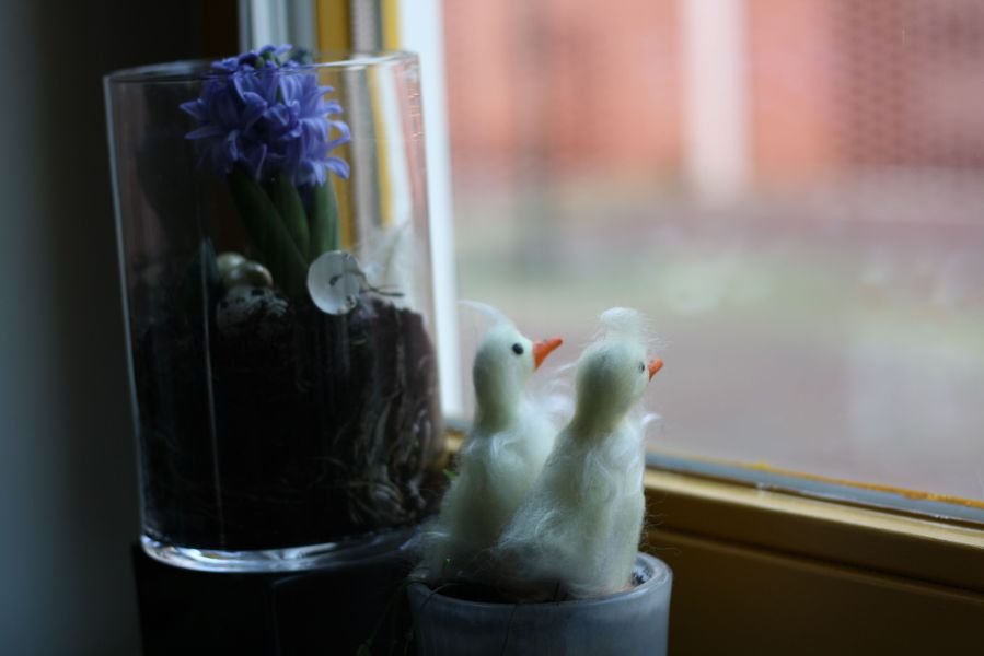 hyacint en kuikentje in de vensterbank