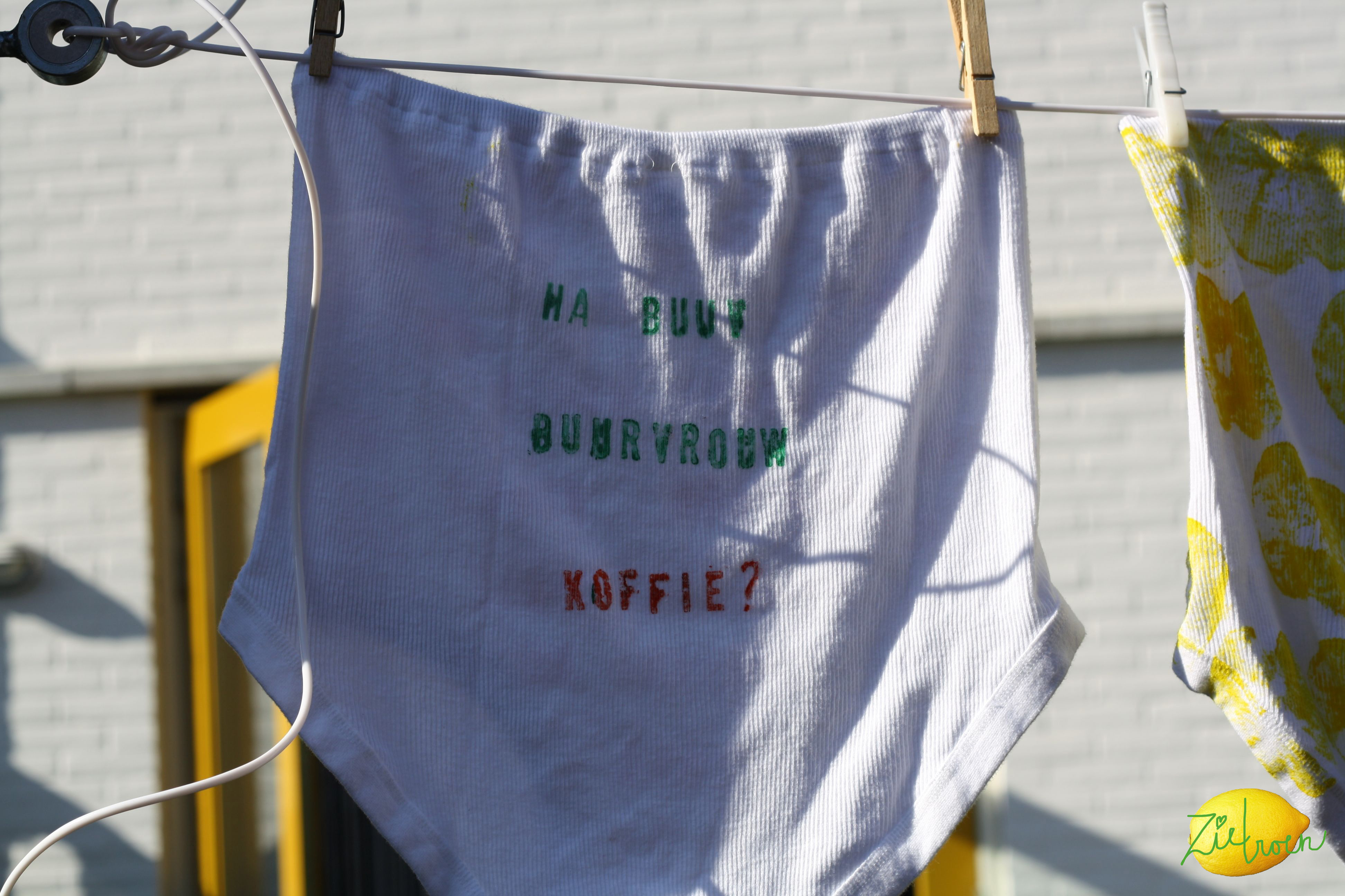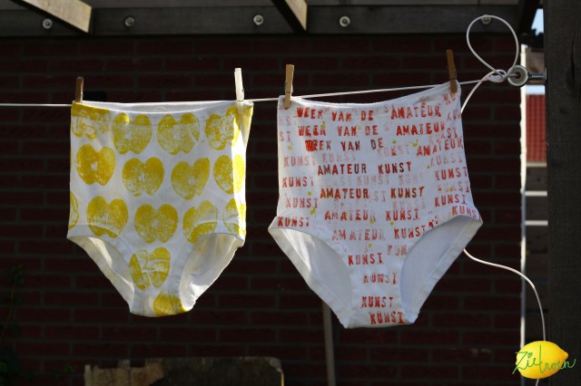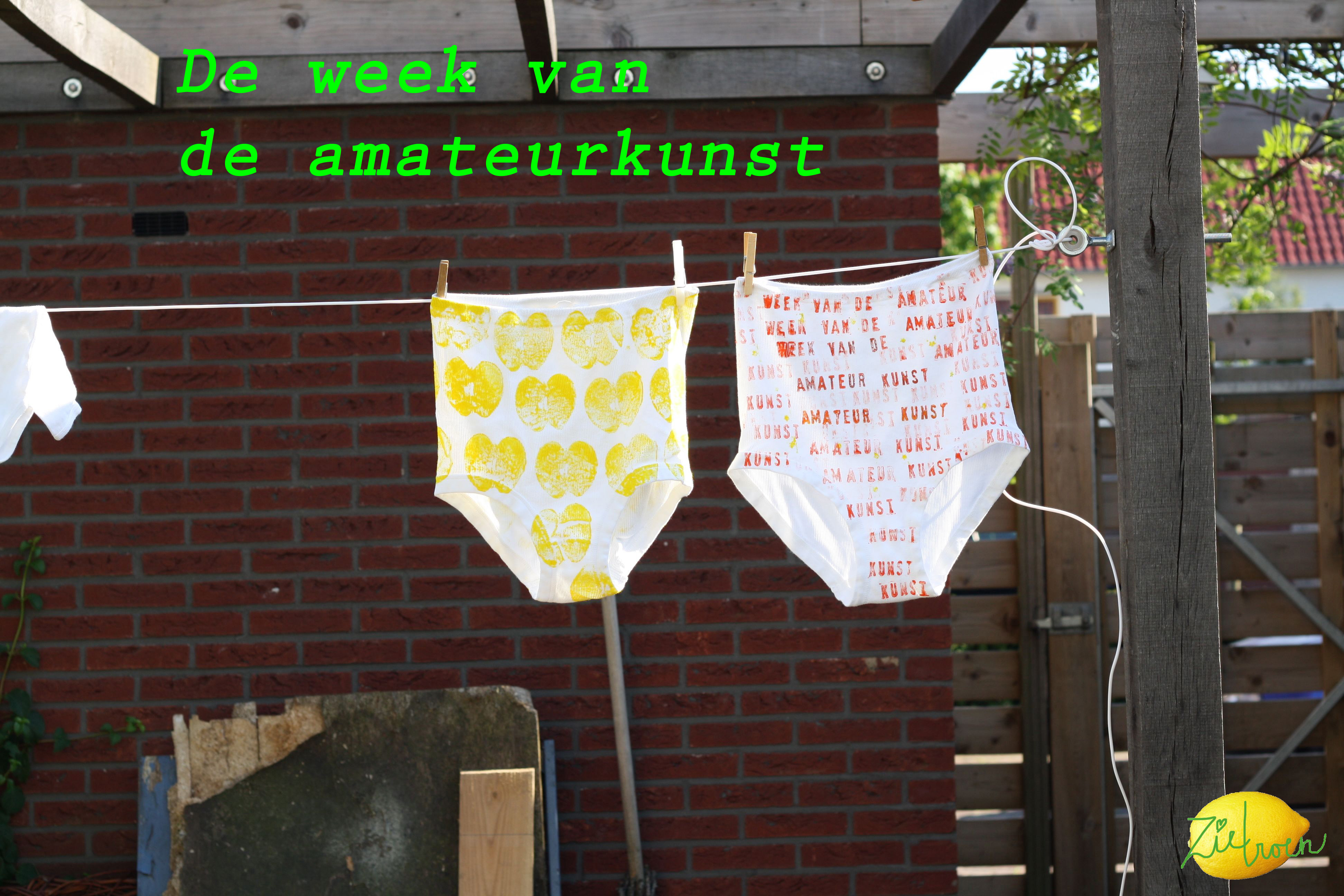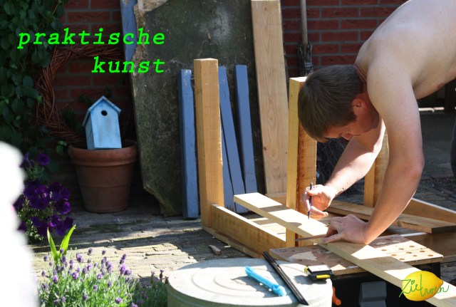Het is de week van de amateurkunst. Samen met wat buurtjes doen we mee. Met mijn overbuurvrouw Hester en Marjan van links maken we een waslijn met grote beschilderde onderbroeken. De gele is bestempeld met een appel (ideetje van xxMiek, ik zie net dat ze ook bezig is met stempelen, das toevallig) en de rode met een letter-stempeldoos. Lekker bezig dus. We gaan het zometeen ophangen. Binnenkort meer foto’s. Sander heeft gister een start gemaakt met een tuintafel. Hij haalde hiervoor Douglas hout bij Twickel. Het projectje moet even blijven liggen, omdat hij vanmiddag is vertrokken naar Boedapest (Hongarije) waar hij een paar dagen voor z’n werk is.